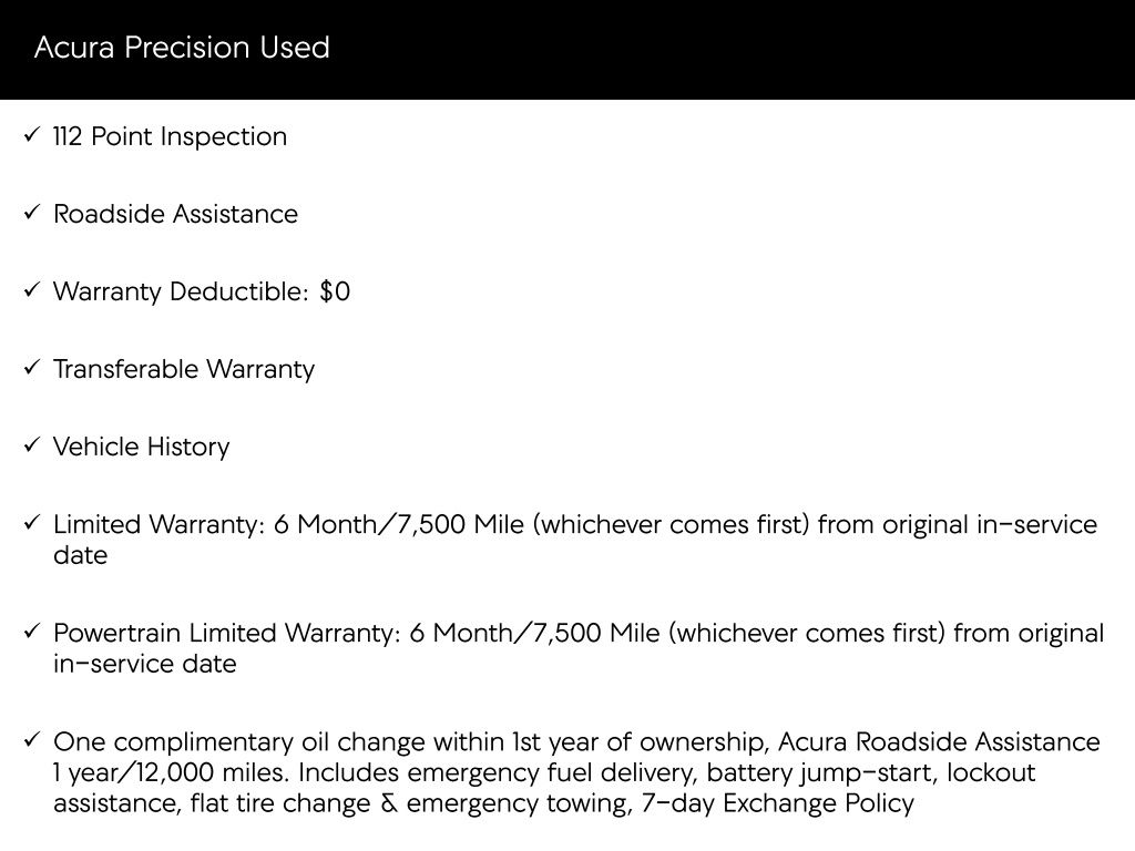 * One complimentary oil change within 1st year of ownership, Acura Roadside Assistance 1 year/12,000 miles. Includes emergency fuel delivery, battery jump-start, lockout assistance, flat tire change & emergency towing, 7-day Exchange Policy