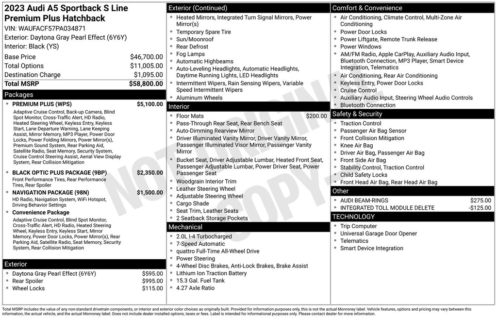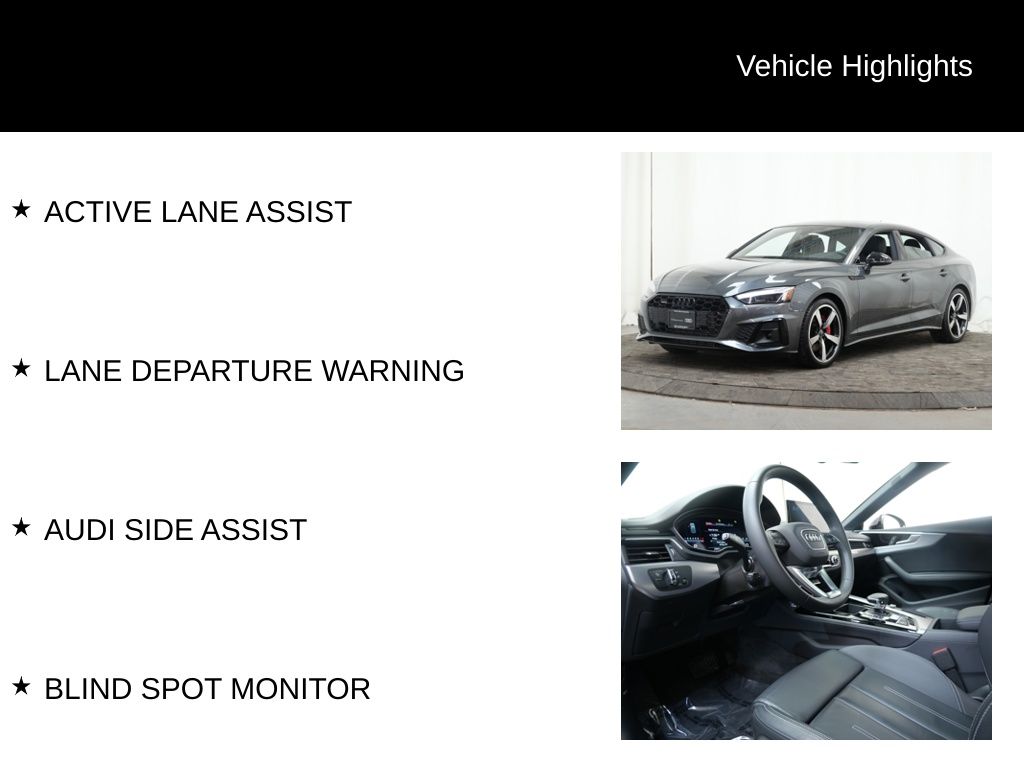 Beyond the exceptional powertrain, this A5 Sportback is equipped with a wealth of premium features that elevate the driving experience. The Premium Plus package includes advanced driver assistance technologies like Audi Active Lane Assist, Audi Side Assist, and Adaptive Cruise Control, ensuring a safer and more connected drive. The stunning Bang & Olufsen sound system and Audi Virtual Cockpit Plus provide unparalleled audio and information displays, while the panoramic sunroof and heated steering wheel add to the vehicle's luxurious ambiance.