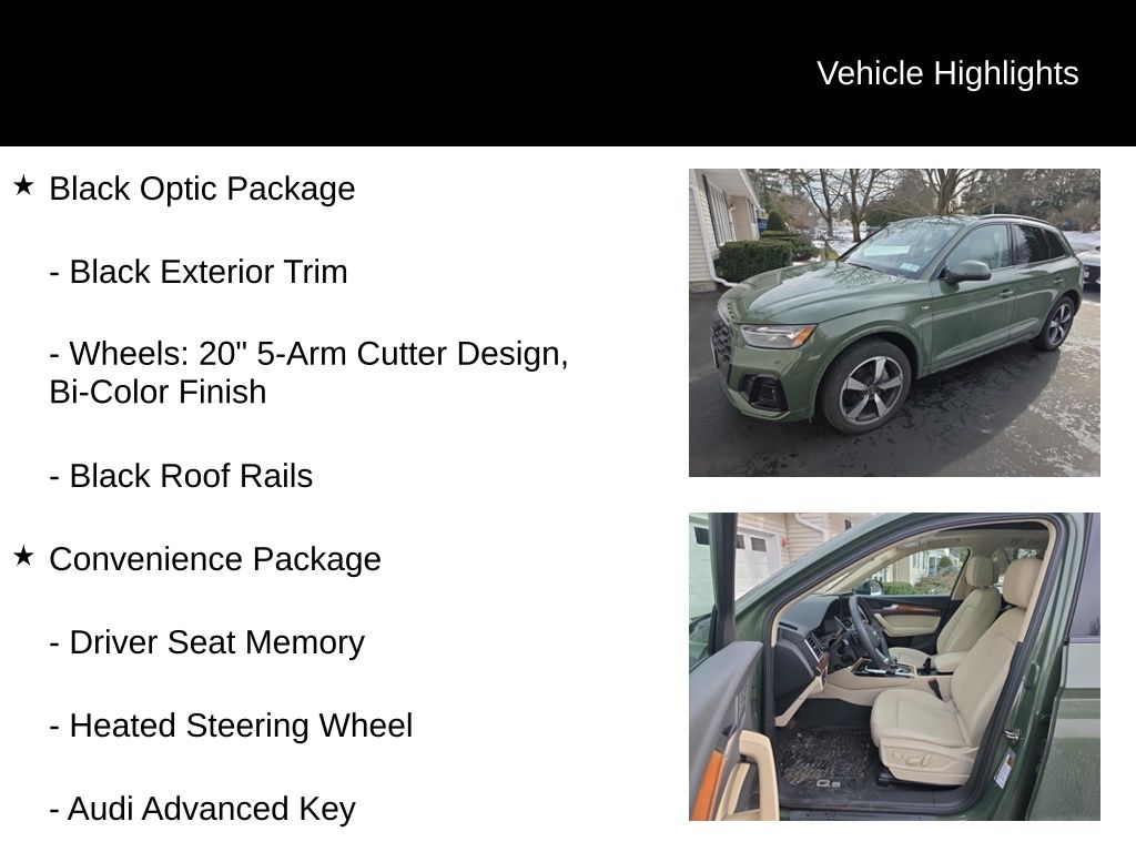 Q5 Prestige with Warm Weather package (Sport Seat both front seats identical with cool ventilation). Riding on air. There is no other way to put it. The sport seats difference other than cooling is “wings” that hold your butt and back in place, a 24 position electric adjustment on BOTH identical front seats with thigh support extenders, excellent for a couple with very bad backs. Power: watch out for fishtailing as you can feel G forces when accelerating, if you want. When researching a replacement for our sloppy 2017 Pilot I noticed most owners of other new vehicles in the south were complaining about AC unable to keep up with the Florida, Texas and desert heats. No problem here, the Q5 has more cool air than needed here at 5200’ in the sunny July southwest desert. Instrumentation is terrific with heads up display, maps and routing directly in front of the driver. (What is more ridiculous than the cars that put the map in the center stack and aim it straight to the rear of the car? Who is sitting on the shift to look forward at the map?) Moving on, the interior materials scream quality. Plenty of rear legroom for a knee replacement patient and headroom not a problem anywhere. Rear seats recline a couple inches. Owners manual very well written with detail. You can spend an evening laughing hysterically at the index though. Looking to program the garage door opener? Look in a subcategory under “O”, “Open and Close”! It goes on, and kept us looking up things just to laugh at where they are. Summarizing: most comfortable luxurious road rocket I’ve ever owned. - 5.0