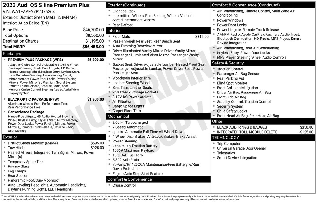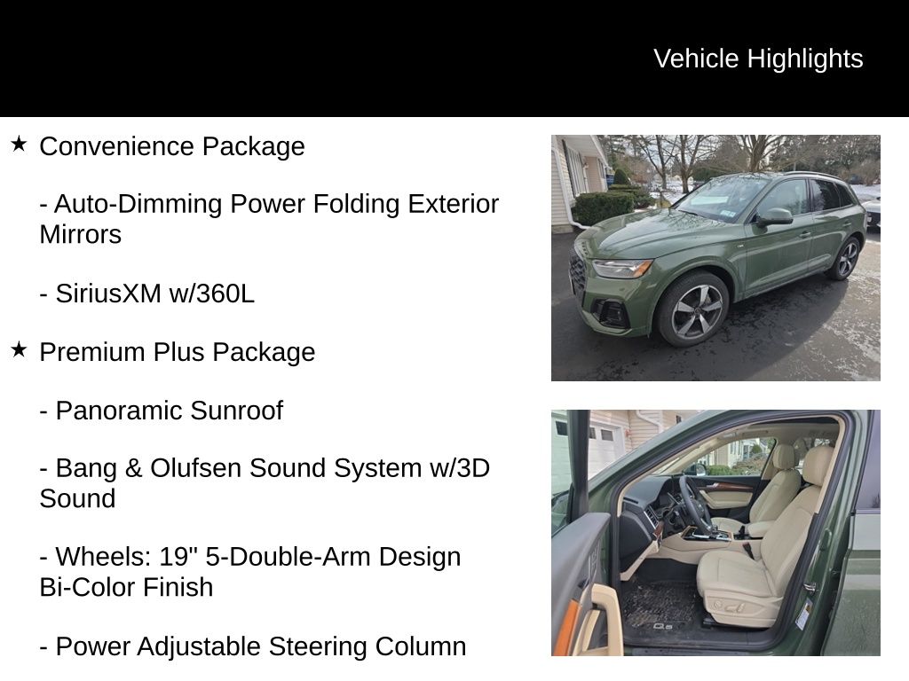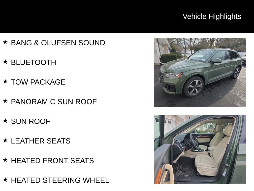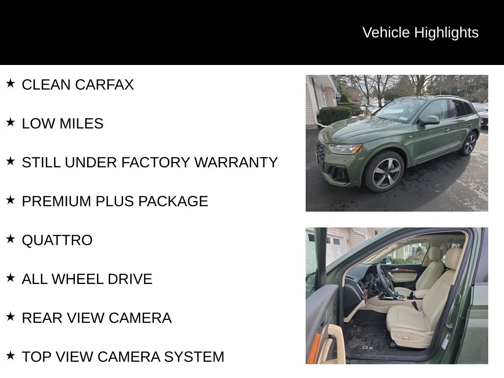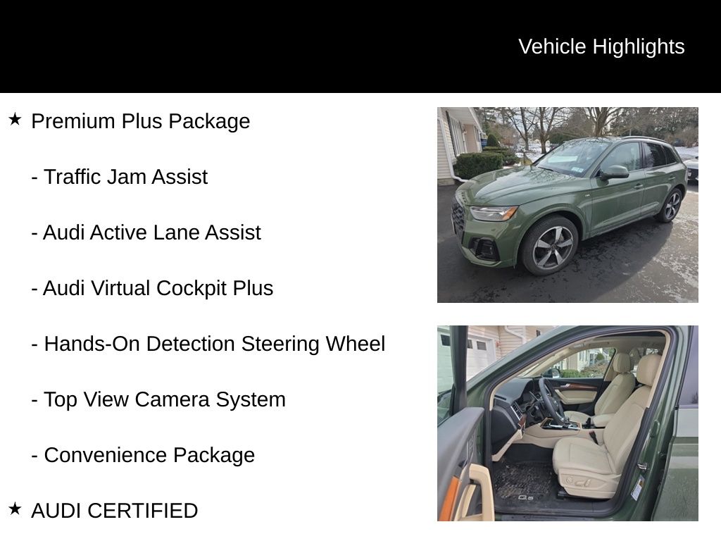 Certified. CARFAX One-Owner. Clean CARFAX. AUDI CERTIFIED, ONE OWNER, CLEAN CARFAX, LOW MILES, STILL UNDER FACTORY WARRANTY, PREMIUM PLUS PACKAGE, QUATTRO, ALL WHEEL DRIVE, REAR VIEW CAMERA, TOP VIEW CAMERA SYSTEM, BANG & OLUFSEN SOUND, BLUETOOTH, TOW PACKAGE, PANORAMIC SUN ROOF, SUN ROOF, LEATHER SEATS, HEATED FRONT SEATS, HEATED STEERING WHEEL, ADAPTIVE CRUISE CONTROL, ACTIVE LANE ASSIST, LANE DEPARTURE WARNING, AUDI SIDE ASSIST, BLIND SPOT MONITOR, Atlas Beige Leather, ABS brakes, Alloy wheels, Audi Active Lane Assist, Audi Advanced Key, Audi Virtual Cockpit Plus, Bang & Olufsen Sound System w/3D Sound, Black Exterior Trim, Black Optic Package, Black Roof Rails, Compass, Convenience Package, Driver Seat Memory, Electronic Stability Control, Front dual zone A/C, Hands-On Detection Steering Wheel, Heated door mirrors, Heated front seats, Heated Steering Wheel, Illuminated entry, Leatherette Covered Center Console & Door Armrests, Low tire pressure warning, Panoramic Sunroof, Power Adjustable Steering Column, Power Liftgate, Premium Plus Package, Remote keyless entry, Top View Camera System, Traction control, Traffic Jam Assist, Trailer Hitch, Wheels: 20" 5-Arm Cutter Design, Bi-Color Finish.