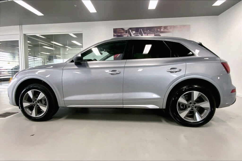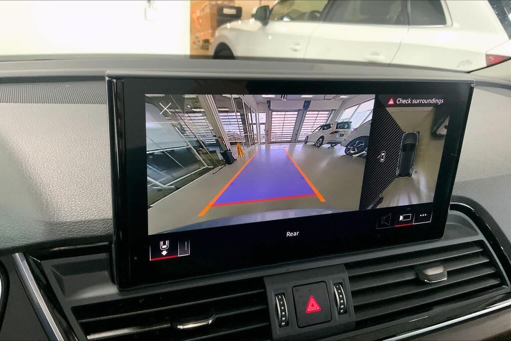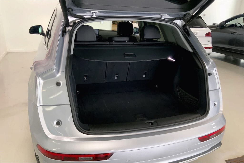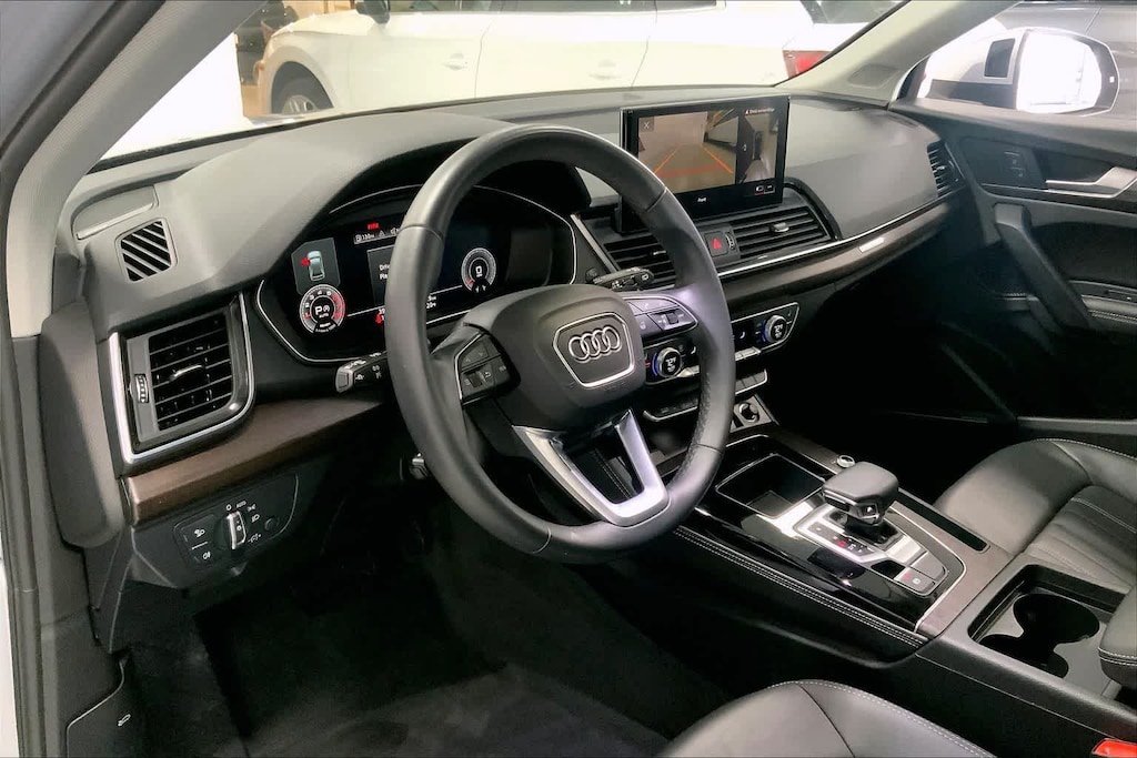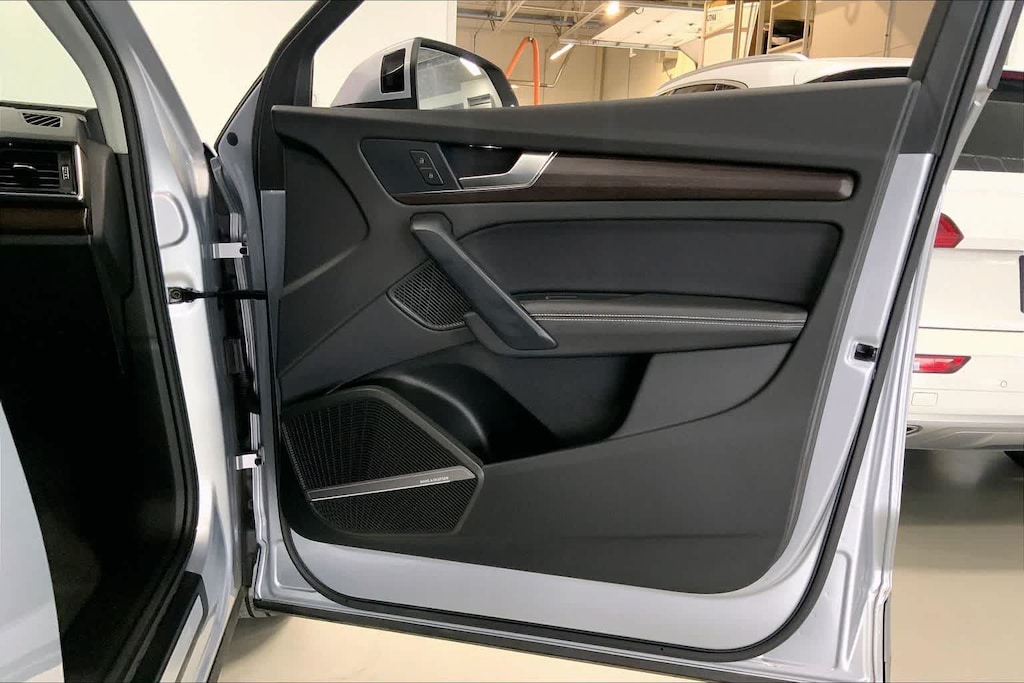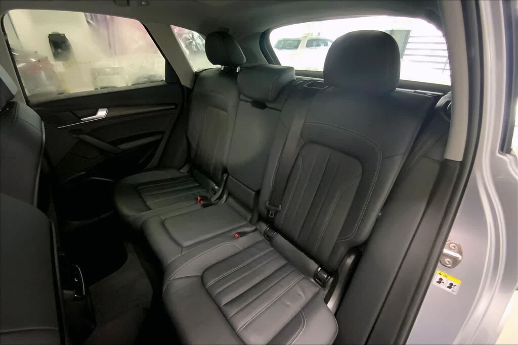 Q5 40 Premium Plus is nicely equipped with Convenience Package (Audi Advanced Key, Auto-Dimming Power Folding Exterior Mirrors, Driver Seat & Mirror Memory, Heated Steering Wheel, and SiriusXM w/360L), Premium Plus Package (Audi Active Lane Assist, Audi Virtual Cockpit Plus, Bang & Olufsen Sound System w/3D Sound, Hands-On Detection Steering Wheel, Leatherette Covered Center Console & Door Armrests, Panoramic Sunroof, Power Adjustable Steering Column, Top View Camera System, Traffic Jam Assist, and Wheels: 19 5-Arm-Pylon Design w/Matte Finish), Black Leather, 10 Speakers, 4-Wheel Disc Brakes, 5.302 Axle Ratio, ABS brakes, Air Conditioning, Alloy wheels, AM/FM radio, Audi Beam-Rings, Audi Guard All-Weather Floor Mats (Set of 4), Auto High-beam Headlights, Auto-dimming Rear-View mirror, Automatic temperature control, Brake assist, Bumpers: body-color, Compass, Delay-off headlights, Driver door bin, Driver vanity mirror, Dual front impact airbags, Dual front side impact airbags, Electronic Stability Control, Emergency communication system: Audi connect CARE, Exterior Parking Camera Rear, Four wheel independent suspension, Front anti-roll bar, Front Bucket Seats, Front Center Armrest, Front dual zone A/C, Front fog lights, Front reading lights, Garage door transmitter: HomeLink, Genuine wood console insert, Genuine wood dashboard insert, Genuine wood door panel insert, Gray-Brown Birch Natural Wood Inlays, Heated 8-Way Power Front Bucket Seats, Heated door mirrors, Heated front seats, Illuminated entry, Integrated Toll Module Delete (DISC), Leather Seating Surfaces, Leather Shift Knob, Low tire pressure warning, Occupant sensing airbag, Outside temperature display, Overhead airbag, Overhead console, Panic alarm, Passenger door bin, Passenger vanity mirror, Power door mirrors, Power driver seat, Power Liftgate, Power passenger seat, Power steering, Power windows, Privacy Trunk Cover, Radio data system, Radio: Audi Sound System, Rain sensing wipers, Rear air conditioning, Rear anti-roll bar, Rear fog lights, Rear reading lights, Rear seat center armrest, Rear window defroster, Rear window wiper, Remote keyless entry, Roof rack, Security system, Speed control, Speed-sensing steering, Speed-Sensitive Wipers, Split folding rear seat, Spoiler, Steering wheel mounted audio controls, Tachometer, Telescoping steering wheel, Tilt steering wheel, Traction control, Trip computer, Turn signal indicator mirrors, Variably intermittent wipers, and Wheels: 18 5-Arm-Star Design.