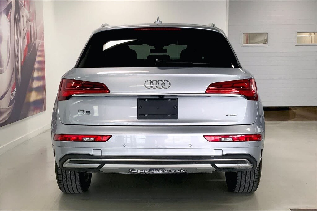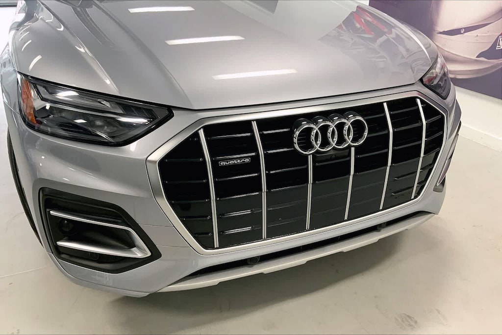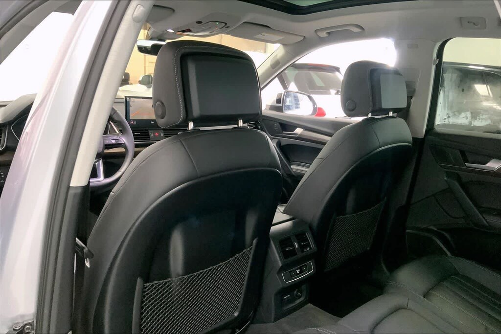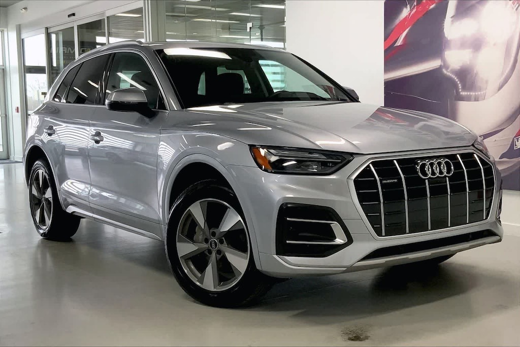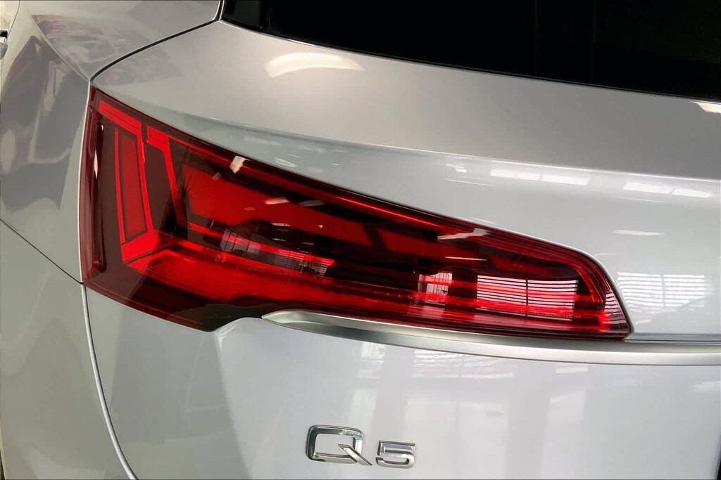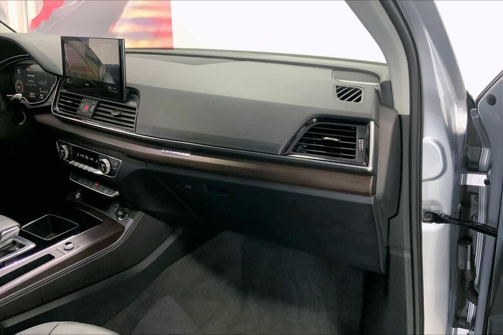 Q5 40 Premium Plus is nicely equipped with Convenience Package (Audi Advanced Key, Auto-Dimming Power Folding Exterior Mirrors, Driver Seat & Mirror Memory, Heated Steering Wheel, and SiriusXM w/360L), Premium Plus Package (Audi Active Lane Assist, Audi Virtual Cockpit Plus, Bang & Olufsen Sound System w/3D Sound, Hands-On Detection Steering Wheel, Leatherette Covered Center Console & Door Armrests, Panoramic Sunroof, Power Adjustable Steering Column, Top View Camera System, Traffic Jam Assist, and Wheels: 19 5-Arm-Pylon Design w/Matte Finish), Black Leather, 10 Speakers, 4-Wheel Disc Brakes, 5.302 Axle Ratio, ABS brakes, Air Conditioning, Alloy wheels, AM/FM radio, Audi Beam-Rings, Audi Guard All-Weather Floor Mats (Set of 4), Auto High-beam Headlights, Auto-dimming Rear-View mirror, Automatic temperature control, Brake assist, Bumpers: body-color, Compass, Delay-off headlights, Driver door bin, Driver vanity mirror, Dual front impact airbags, Dual front side impact airbags, Electronic Stability Control, Emergency communication system: Audi connect CARE, Exterior Parking Camera Rear, Four wheel independent suspension, Front anti-roll bar, Front Bucket Seats, Front Center Armrest, Front dual zone A/C, Front fog lights, Front reading lights, Garage door transmitter: HomeLink, Genuine wood console insert, Genuine wood dashboard insert, Genuine wood door panel insert, Gray-Brown Birch Natural Wood Inlays, Heated 8-Way Power Front Bucket Seats, Heated door mirrors, Heated front seats, Illuminated entry, Integrated Toll Module Delete (DISC), Leather Seating Surfaces, Leather Shift Knob, Low tire pressure warning, Occupant sensing airbag, Outside temperature display, Overhead airbag, Overhead console, Panic alarm, Passenger door bin, Passenger vanity mirror, Power door mirrors, Power driver seat, Power Liftgate, Power passenger seat, Power steering, Power windows, Privacy Trunk Cover, Radio data system, Radio: Audi Sound System, Rain sensing wipers, Rear air conditioning, Rear anti-roll bar, Rear fog lights, Rear reading lights, Rear seat center armrest, Rear window defroster, Rear window wiper, Remote keyless entry, Roof rack, Security system, Speed control, Speed-sensing steering, Speed-Sensitive Wipers, Split folding rear seat, Spoiler, Steering wheel mounted audio controls, Tachometer, Telescoping steering wheel, Tilt steering wheel, Traction control, Trip computer, Turn signal indicator mirrors, Variably intermittent wipers, and Wheels: 18 5-Arm-Star Design.