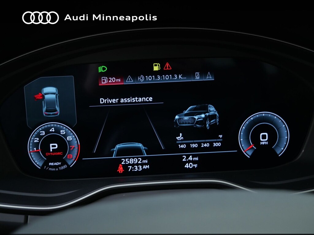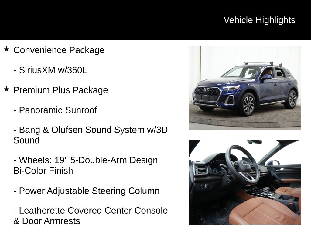 The Premium Plus Package elevates this Q5 with a host of premium features, including the stunning Bang & Olufsen sound system, the convenience of the Top View Camera System, and the added safety and assistance of Audi's advanced driver aids. The panoramic sunroof and leather-appointed seats further enhance the luxurious cabin, creating a truly refined and enjoyable driving environment.