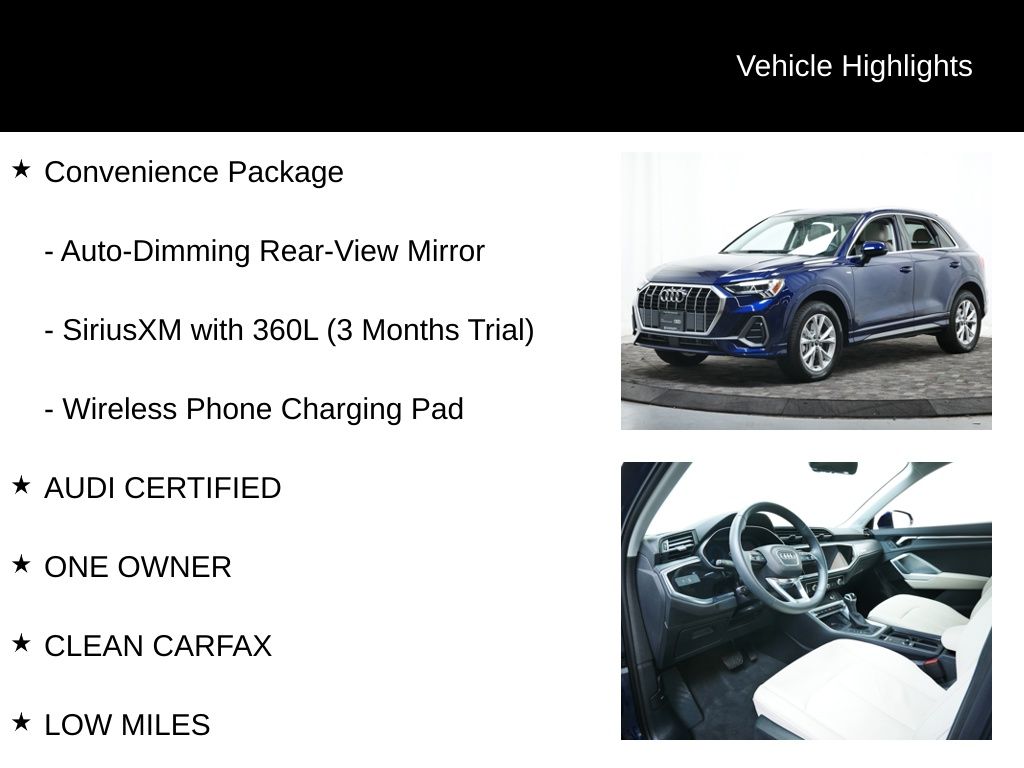 Certified. CARFAX One-Owner. Clean CARFAX. AUDI CERTIFIED, ONE OWNER, CLEAN CARFAX, LOW MILES, STILL UNDER FACTORY WARRANTY, PREMIUM PACKAGE, QUATTRO, ALL WHEEL DRIVE, REAR VIEW CAMERA, BLUETOOTH, PANORAMIC SUN ROOF, SUN ROOF, LEATHER SEATS, HEATED FRONT SEATS, ADAPTIVE CRUISE CONTROL, ACTIVE LANE ASSIST, LANE DEPARTURE WARNING, AUDI SIDE ASSIST, BLIND SPOT MONITOR, Audi Advanced Key, Auto-Dimming Power-Folding Exterior Mirrors, Auto-Dimming Rear-View Mirror, Convenience Package, Driver Seat Memory, Garage Door Opener (HomeLink), LED Interior Lighting Package, Wireless Phone Charging Pad.