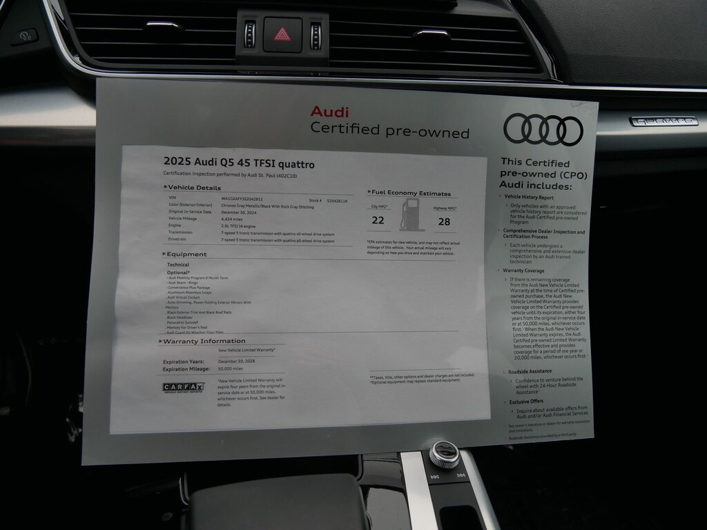 Audi Certified pre-owned Details: * Roadside Assistance for one year. Certified pre-owned Limited Warranty: For all CPO sales on or after 8/1/23, if New Vehicle Limited Warranty (NVLW) coverage remains at time of CPO purchase, CPO Limited Warranty Coverage commences upon expiration of NVLW and continues for a period of one year or 20,000 miles, whichever occurs first. If NVLW coverage has expired at time of CPO purchase, CPO Limited Warranty coverage commences at time of purchase and continues for one year or 20,000 miles, whichever occurs first. * Vehicle History * 125+ Point Inspection * Warranty Deductible: $0 * Roadside Assistance.