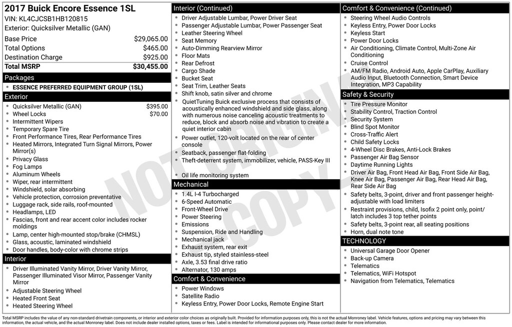Certified. 2017 Buick Encore Essence Is nicely equipped with Preferred Equipment Group 1SL (6-Speaker Audio System), Ford Blue Advantage: Blue Certified Certified, 18" Aluminum Wheels, 3.53 Final Drive Axle Ratio, 4-Wheel Disc Brakes, 6 Speakers, 6-Way Power Driver Seat Adjuster, 6-Way Power Front Passenger Seat Adjuster, ABS brakes, Air Conditioning, Alloy wheels, AM/FM radio: SiriusXM, Apple CarPlay/Android Auto, Auto-dimming Rear-View mirror, Automatic temperature control, Black Carbon Metallic Lower Exterior Accent Color, Brake assist, Bumpers: body-color, Compass, Delay-off headlights, Driver door bin, Driver vanity mirror, Driver's Seat Mounted Armrest, Dual front impact airbags, Dual front side impact airbags, Electronic Stability Control, Emergency communication system: OnStar Guidance, Exterior Parking Camera Rear, Front anti-roll bar, Front Bucket Seats, Front dual zone A/C, Front fog lights, Front reading lights, Front wheel independent suspension, Fully automatic headlights, Garage door transmitter, Heated door mirrors, Heated Driver & Front Passenger Seats, Heated front seats, Heated steering wheel, Illuminated entry, Knee airbag, Leather-Appointed Seat Trim, Low tire pressure warning, Memory seat, Occupant sensing airbag, Outside temperature display, Overhead airbag, Panic alarm, Passenger door bin, Passenger vanity mirror, Power door mirrors, Power driver seat, Power passenger seat, Power steering, Power windows, Premium audio system: IntelliLink, Radio data system, Radio: Buick IntelliLink AM/FM Stereo, Rear seat center armrest, Rear side impact airbag, Rear window defroster, Rear window wiper, Remote keyless entry, Ride & Handling Suspension, Roof rack: rails only, Security system, SiriusXM Satellite Radio, Speed control, Speed-sensing steering, Split folding rear seat, Spoiler, Steering wheel mounted audio controls, Tachometer, Telescoping steering wheel, Tilt steering wheel, Traction control, Trip computer, Turn signal indicator mirrors, Variably intermittent wipers, and Wheel Lock Kit (LPO)