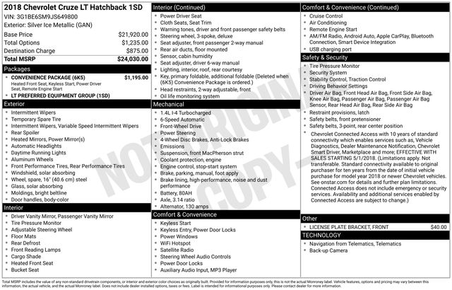 2018 Chevrolet Cruze LT 4D Hatchback FWD 6-Speed Automatic 1.4L 4-Cylinder Turbo DOHC CVVT
