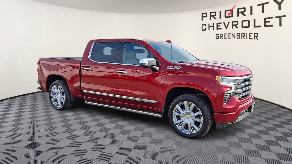 2025 Chevrolet High Country Silverado 1500 Radiant Red Tintcoat Navigation, Leather, Backup Camera, ANDROID AUTO AND APPLE CARPLAY, BLUETOOTH PHONE AND AUDIO, Silverado 1500 High Country, 4D Crew Cab, 3.0L I6, 4WD, Radiant Red Tintcoat, Black Leather, 10-Way Power Driver Seat w/Lumbar, 10-Way Power Passenger Seat Adjuster w/Lumbar, 12.3 Multicolor Reconfigurable Digital Display, 120-Volt Interior Power Outlet, 2 USB Data Ports, 2nd Row Heated Outboard Seats, Adaptive Cruise Control, All-Weather Floor Liner (LPO), Auto-Dimming Inside Rear-View Mirror, Auto-Locking Rear Differential, Bed View Camera, Bluetoothî For Phone, Body-Color Painted Mirror Caps, Chevytec Spray-On Black Bedliner, Chrome Assist Steps, Chrome Recovery Hooks, Color-Keyed Carpeting Floor Covering, Deep-Tinted Glass, Driver Memory, Dual Exhaust w/Polished Outlets, Dual Rear USB Ports (Charge Only), Electric Rear-Window Defogger, Floor Mounted Center Console, Front Carpeted Floor Mats, Front LED Fog Lamps, Front Rain-Sensing Wipers, HD Surround Vision, Heated Driver & Front Outboard Passenger Seats, Heated Steering Wheel, High Capacity Suspension Package, High Country Premium II Package, High Country Premium Package, Hitch Guidance w/Hitch View, In-Vehicle Trailering System App, Integrated Trailer Brake Controller, Keyless Open & Start, LED Cargo Area Lighting, OnStar Services Capable, Outside Heated Power-Adjustable Mirrors, Perimeter Lighting, Power Front Passenger Windows w/Express Up/Down, Power Front Windows w/Driver Express Up/Down, Power Rear Windows w/Express Down, Power Sliding Rear Window w/Rear Defogger, Power Sunroof, Power Tailgate, Power Tilt & Telescoping Steering Column, Power-Retractable Assist Steps, Preferred Equipment Group 3LZ, Rear Carpeted Floor Mats, Rear Cross Traffic Braking, Rear Pedestrian Alert, Rear Wheelhouse Liners, Remote Vehicle Starter System, Safety Alert Seat, SiriusXM w/360L Trial Subscription, Standard Tailgate, Steering Wheel Audio Controls, Technology Package, Teen Driver, Theft Deterrent System (Unauthorized Entry), Tire Pressure Monitoring System, Trailer Camera Provisions, Trailer Side Blind Zone Alert, Trailering Package, Ultrasonic Front & Rear Park Assist, Universal Home Remote, Up-Level Rear Seat w/Storage Package, Ventilated Driver & Front Passenger Seats, Wheels: 22 x 9 Painted Aluminum, Wrapped Steering Wheel. Certified. CARFAX One-Owner. Certification Program Details: When you choose a certified used vehicle less than 10 model years old and with less than 100,000 miles, you??ll get 6-month/6,000-mile * limited bumper-to-bumper warranty coverage with no deductible.