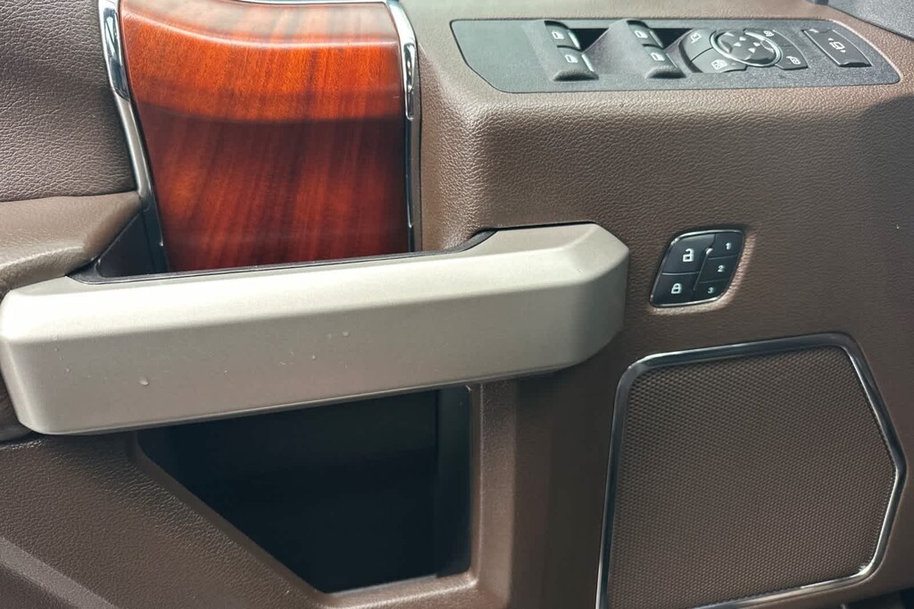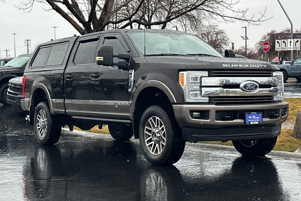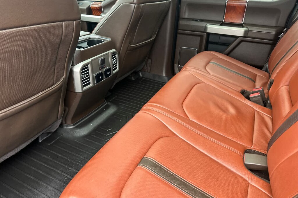 ENGINE: 6.7L 4V OHV POWER STROKE V8 TURBO DIESEL B20 manual push-button engine-exhaust braking and intelligent oil-life monitor, Dual Extra Heavy-Duty Alternators (Total 377-Amps), Extra Heavy-Duty 220 Amp Alternator, 3.31 Axle Ratio, 34 Gallon Fuel Tank, GVWR: 11,500 lb Payload Package, Dual 78-AH 750 CCA Batteries, KING RANCH ULTIMATE PACKAGE Twin Panel Power Moonroof, map lights and moonroof switches, Blind Spot Information System (BLIS), cross-traffic alert and trailer tow (BLIS sensor in taillamp), Tailgate Step & Handle, Quad Beam LED Headlamps & LED Taillamps, LED fog lamps and LED Center High-Mounted Stop Lamp (CHMSL), Power-Deployable Running Boards, Multi-Contour Seats, WHEELS: 20 BRIGHT MACHINED CAST ALUMINUM light caribou painted pockets and light caribou wheel ornaments w/King Ranch logo, ULTIMATE TRAILER TOW CAMERA SYSTEM 360 degree camera system and trailer reverse guidance, Display appears in center-stack screen, NOTE: Does not include customer placed trailer camera, Rear CHMSL Camera, Display in center stack screen, LED Center High-Mounted Stop Lamp (CHMSL) w/cargo light and rear video camera, TOUGH BED SPRAY-IN BEDLINER tailgate-guard, black box bed tie-down hooks, black bed attachment bolts and BoxLink mounting plates, ELECTRONIC-LOCKING W/3.55 AXLE RATIO, HEATED REAR SEATS, TRANSMISSION: TORQSHIFT 6-SPEED AUTOMATIC (6R140), SelectShift. 2018 Ford Super Duty F-350 SRW Pickup with Magma Red/Stone Gray exterior and Java interior features a 8 Cylinder Engine with 450 HP at 2800 RPM*.