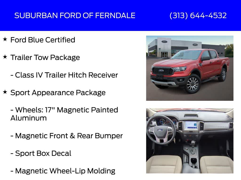 Chili Pepper Red 2019 Ford Ranger XLT 4WD 10-Speed Automatic EcoBoost 2.3L I4 GTDi DOHC Turbocharged VCT Ford Blue Certified, 4WD, 4x4 FX4 Off-Road Bodyside Decal, Black Grille w/Magnetic Surround, Class IV Trailer Hitch Receiver, Electronic-Locking Rear Differential, Exposed Front Tow Hooks, Exterior Parking Camera Rear, Fully Automatic Headlights, FX4 Off-Road Package, Magnetic Front & Rear Bumper, Magnetic Wheel-Lip Molding, Off-Road Screen in Cluster, Off-Road Tuned Suspension, Radio: AM/FM Stereo w/6 Speakers, Sport Appearance Package, Sport Box Decal, Terrain Management System, Trailer Tow Package, Wheels: 17 Magnetic Painted Aluminum.