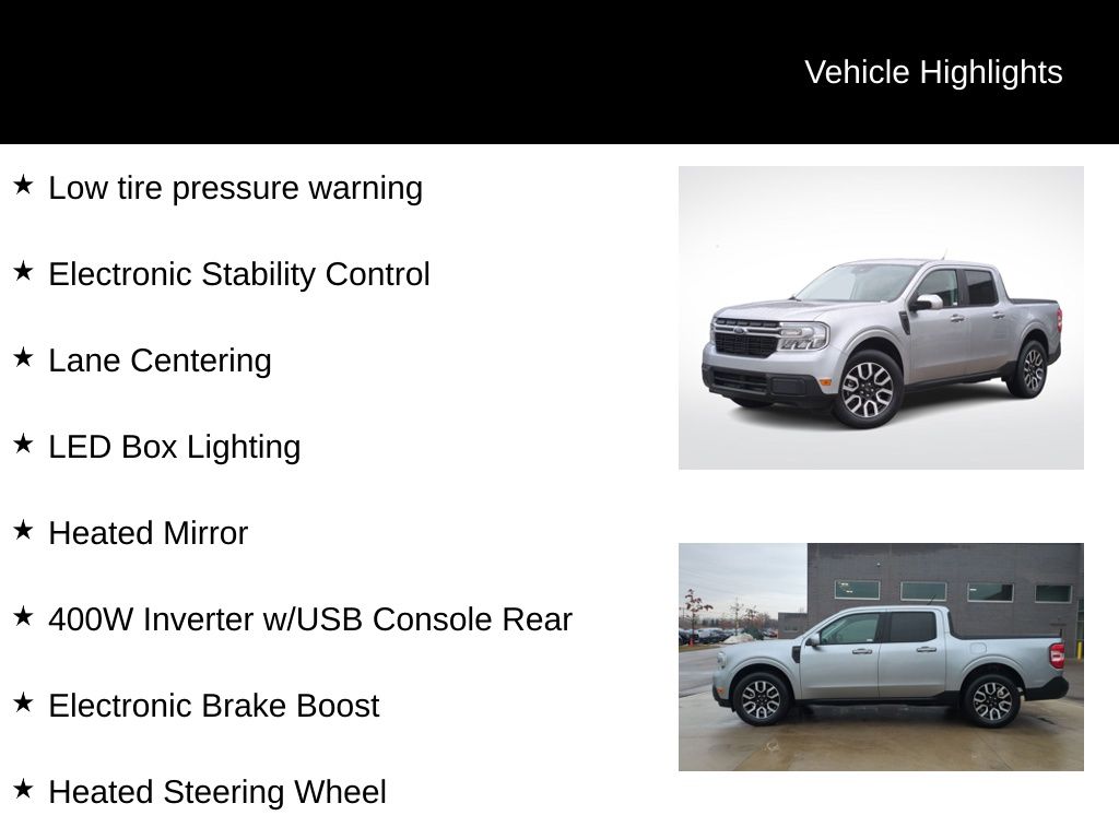 Clean CARFAX. Certified. 2023 Ford Maverick Lariat Is nicely equipped with Equipment Group 500A Standard, Ford Co-Pilot360 (BLIS Blind Spot Info System w/Cross-Traffic Alert and Lane-Keeping System), Lariat Luxury Package (4-Way Front Headrest, 400W Inverter w/USB Console Rear, Bed Tie Down Locking Rails, Electronic Brake Boost, Heated Mirror, Heated Seats, Heated Steering Wheel, Lane Centering, LED Box Lighting, Radio: B&O Sound System by Bang & Olufsen, Trailer Hitch Receiver w/4-Pin Connector, Voice-Activated Touchscreen Navigation System, Windshield Wiper De-Icer, and Wireless Charging Pad), Ford Blue Advantage: Blue Certified Certified, ABS brakes, Alloy wheels, Compass, Electronic Stability Control, Front dual zone A/C, Illuminated entry, Low tire pressure warning, Remote keyless entry, Traction control, 3.63 Axle Ratio, 4-Wheel Disc Brakes, 6 Speakers, ActiveX Trimmed Front Bucket Seats, Air Conditioning, AM/FM radio, Apple CarPlay/Android Auto, Auto High-beam Headlights, Automatic temperature control, Brake assist, Bumpers: body-color, Delay-off headlights, Driver door bin, Driver vanity mirror, Dual front impact airbags, Dual front side impact airbags, Exterior Parking Camera Rear, Four wheel independent suspension, Front anti-roll bar, Front Bucket Seats, Front Center Armrest, Front reading lights, Fully automatic headlights, Knee airbag, Occupant sensing airbag, Outside temperature display, Overhead airbag, Overhead console, Panic alarm, Passenger door bin, Passenger vanity mirror, Power door mirrors, Power driver seat, Power steering, Power windows, Radio data system, Radio: AM/FM Stereo w/6 Speakers, Rear anti-roll bar, Rear seat center armrest, Rear step bumper, Security system, Speed control, Speed-sensing steering, Steering wheel mounted audio controls, Tachometer, Telescoping steering wheel, Tilt steering wheel, Trip computer, and Wheels: 18" Machined-Face Bright Aluminum.