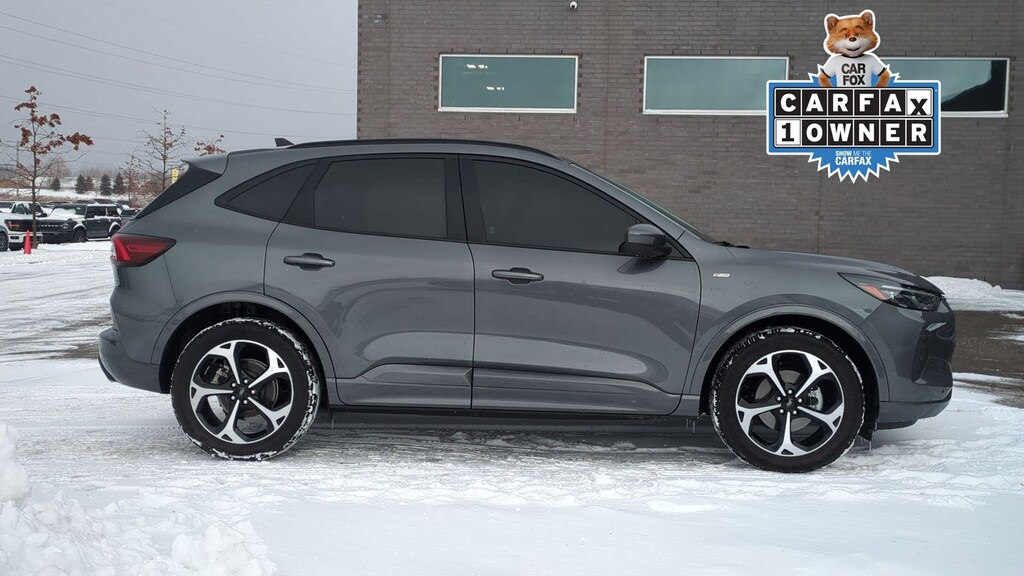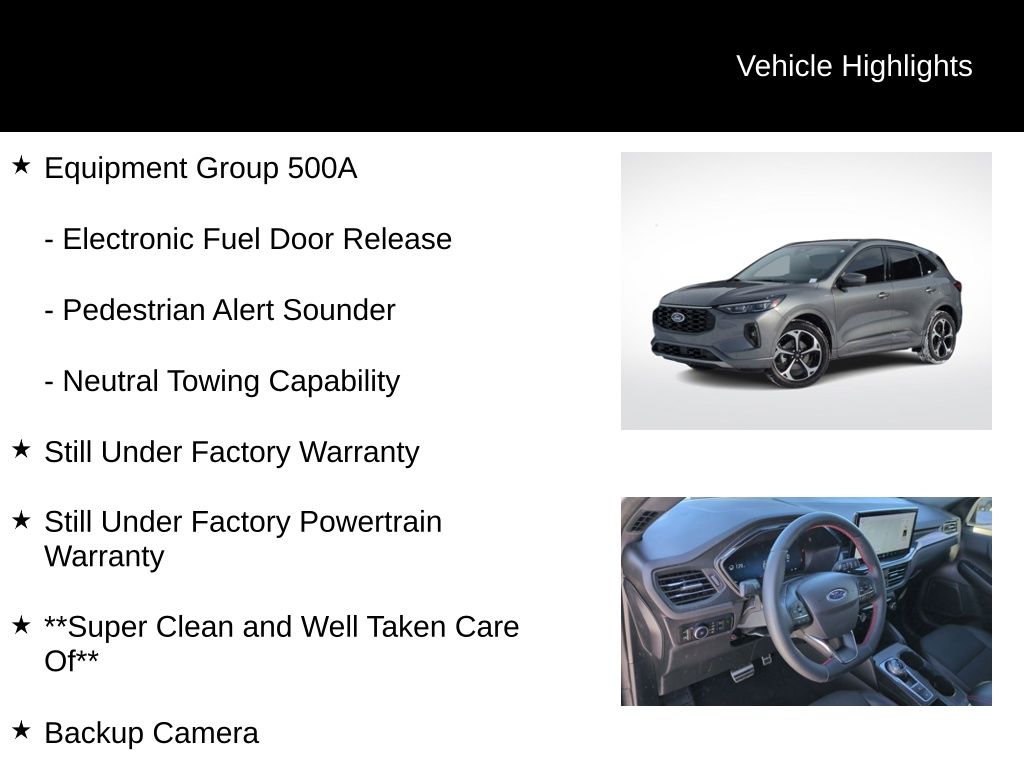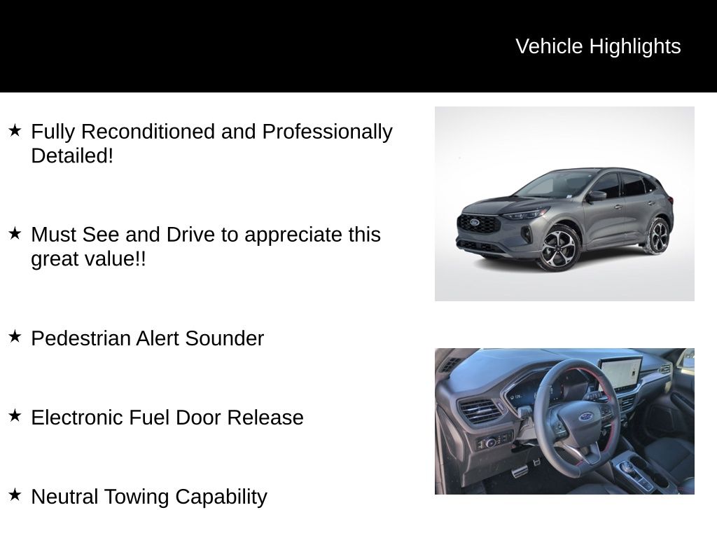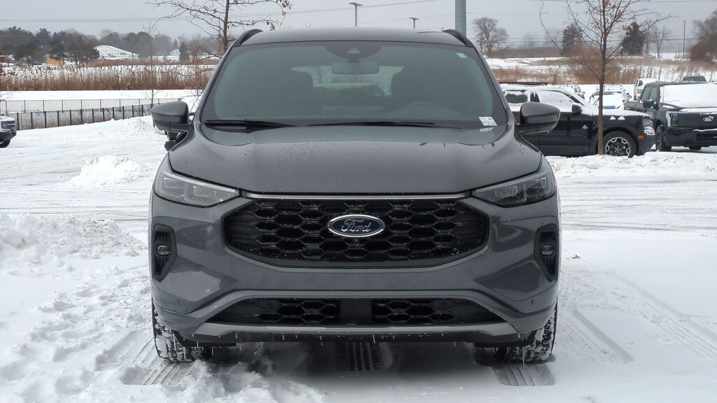 Recent Arrival! Clean CARFAX. Certified. 2024 Ford Escape Hybrid ST-Line Elite Is nicely equipped with Equipment Group 500A (Electronic Fuel Door Release, Neutral Towing Capability, and Pedestrian Alert Sounder), Ford Blue Advantage: Blue Certified Certified, 2.5L iVCT, 2.91 Axle Ratio, 4-Wheel Disc Brakes, 6 Speakers, ABS brakes, Air Conditioning, Alloy wheels, AM/FM radio: SiriusXM, AM/FM Stereo, Auto High-beam Headlights, Auto-dimming Rear-View mirror, Automatic temperature control, Brake assist, Bumpers: body-color, Compass, Delay-off headlights, Driver door bin, Driver vanity mirror, Dual front impact airbags, Dual front side impact airbags, Electronic Stability Control, Emergency communication system: SYNC 4 911 Assist, Exterior Parking Camera Rear, FordPass Connect, Four wheel independent suspension, Front anti-roll bar, Front Bucket Seats, Front Center Armrest, Front dual zone A/C, Front fog lights, Front reading lights, Fully automatic headlights, Garage door transmitter, Heated door mirrors, Heated front seats, Heated steering wheel, Heated Vinyl/Cloth Front Sport Contour Bucket Seats, Illuminated entry, Knee airbag, Low tire pressure warning, Memory seat, Navigation system: Connected Navigation, Occupant sensing airbag, Outside temperature display, Overhead airbag, Overhead console, Panic alarm, Passenger door bin, Passenger vanity mirror, Power door mirrors, Power driver seat, Power Liftgate, Power passenger seat, Power steering, Power windows, Radio data system, Rain sensing wipers, Rear anti-roll bar, Rear reading lights, Rear seat center armrest, Rear window defroster, Rear window wiper, Remote keyless entry, Roof rack: rails only, Security system, Speed control, Speed-sensing steering, Speed-Sensitive Wipers, Split folding rear seat, Spoiler, Sport steering wheel, Steering wheel mounted audio controls, SYNC 4 w/Enhanced Voice Recognition, Tachometer, Telescoping steering wheel, Tilt steering wheel, Traction control, Trip computer, Variably intermittent wipers, and Wheels: 19" Machined-Face Ebony-Painted Aluminum.