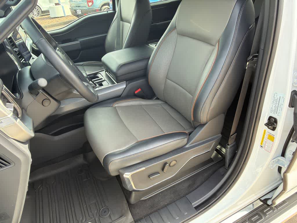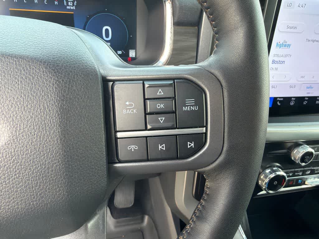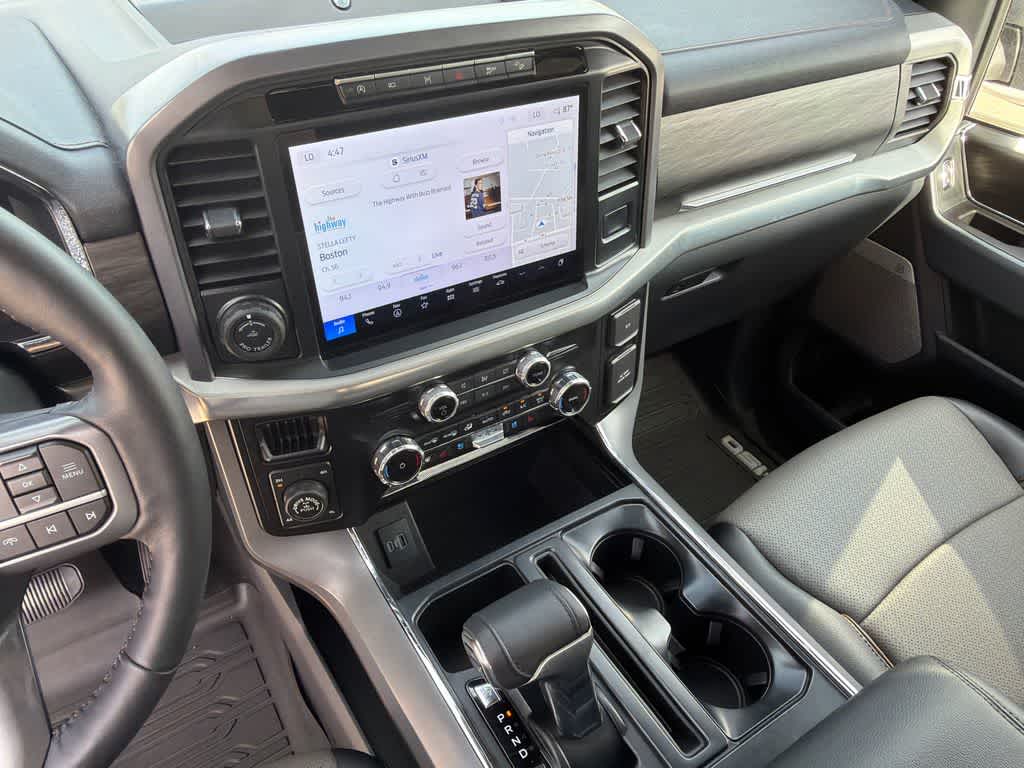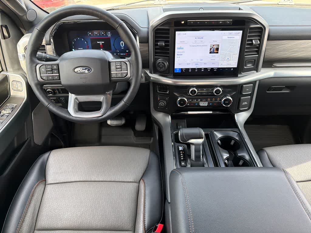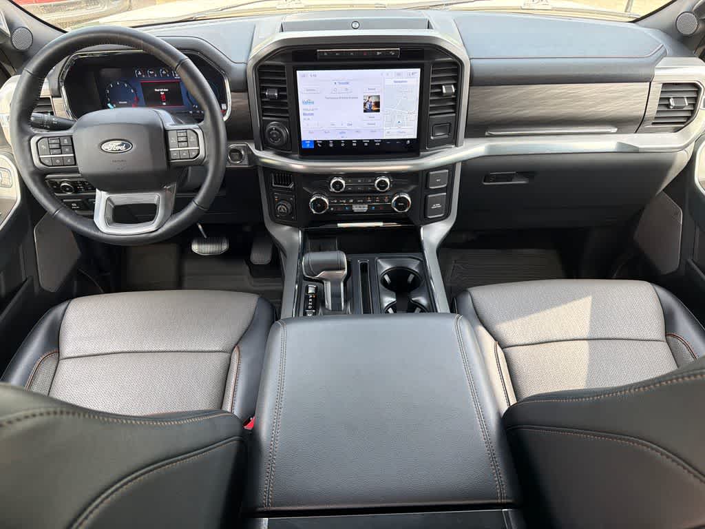 F-150 Lariat is nicely equipped with Equipment Group 501A Standard, FX4 Off-Road Package (4x4 FX4 Off-Road Bodyside Decal, Hill Descent Control, Monotube Rear Shocks, Off-Road Tuned Front Shock Absorbers, and Rock Crawl Mode), Ford Blue Certified Certified, 4WD, 4-Wheel Disc Brakes, 8 Speakers, ABS brakes, Adjustable pedals, Air Conditioning, Alloy wheels, AM/FM radio: SiriusXM with 360L, Auto High-beam Headlights, Auto-dimming door mirrors, Auto-dimming Rear-View mirror, Automatic temperature control, Brake assist, Bumpers: chrome, Chrome wheels, Compass, Delay-off headlights, Driver door bin, Driver vanity mirror, Dual front impact airbags, Dual front side impact airbags, Electronic Stability Control, Emergency communication system: SYNC 4 911 Assist, Front anti-roll bar, Front Bucket Seats, Front Center Armrest, Front dual zone A/C, Front fog lights, Front reading lights, Front wheel independent suspension, Fully automatic headlights, Garage door transmitter, Heated door mirrors, Heated front seats, Heated steering wheel, Illuminated entry, Leather-Trimmed Bucket Seats, Low tire pressure warning, Memory seat, Navigation system: Connected Navigation, Occupant sensing airbag, Outside temperature display, Overhead airbag, Overhead console, Panic alarm, Passenger door bin, Passenger vanity mirror, Pedal memory, Power door mirrors, Power driver seat, Power passenger seat, Power steering, Power windows, Radio data system, Radio: B&O Sound System by Bang & Olufsen, Rain sensing wipers, Rear reading lights, Rear seat center armrest, Rear step bumper, Rear window defroster, Remote keyless entry, Security system, Speed control, Split folding rear seat, Steering wheel mounted audio controls, SYNC 4 w/Enhanced Voice Recognition, Tachometer, Telescoping steering wheel, Tilt steering wheel, Traction control, Trip computer, Turn signal indicator mirrors, Variably intermittent wipers, Ventilated front seats, Voltmeter, and Wheels: 20 Chrome-Like PVD.