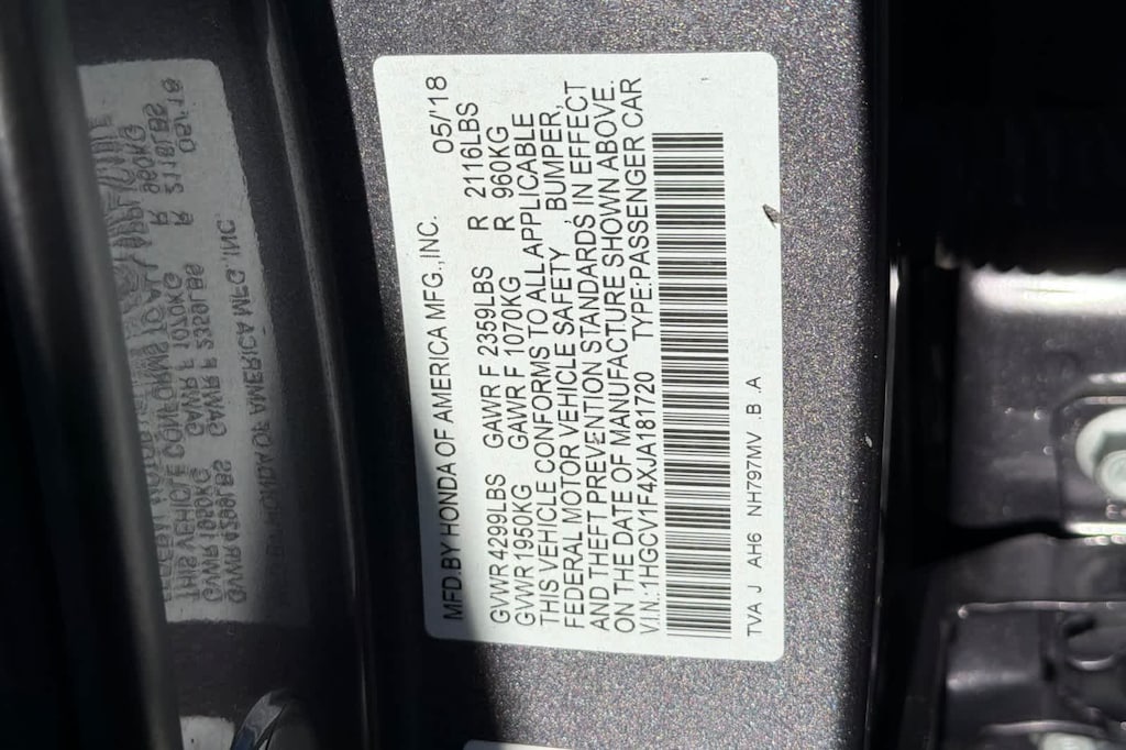 Gray 2018 Honda Accord EX FWD CVT 1.5T I4 DOHC 16V Turbocharged VTEC