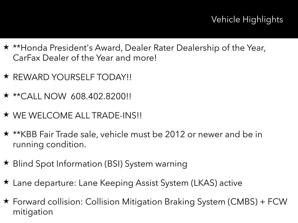 **Honda Presidents Award, Dealer Rater Dealership of the Year, CarFax Dealer of the Year and more!, REWARD YOURSELF TODAY!!, **CALL NOW 608.402.8200!!, WE WELCOME ALL TRADE-INS!!, **KBB Fair Trade sale, vehicle must be 2012 or newer and be in running condition., Besides many of the features just listed, this Honda CR-V also may have many of the following;, HondaTrue Used Certified, AWD, Blind Spot Information (BSI) System warning, Exterior Parking Camera Rear, Forward collision: Collision Mitigation Braking System (CMBS) + FCW mitigation, Lane departure: Lane Keeping Assist System (LKAS) active, 18 Alloy Wheels, 4-Wheel Disc Brakes, 5.64 Axle Ratio, 6 Speakers, ABS brakes, Air Conditioning, Alloy wheels, AM/FM radio: SiriusXM, Apple CarPlay/Android Auto, Auto High-beam Headlights, Automatic temperature control, Brake assist, Bumpers: body-color, Cloth Seat Trim, Compass, Delay-off headlights, Driver door bin, Driver vanity mirror, Dual front impact airbags, Dual front side impact airbags, Electronic Stability Control, Four wheel independent suspension, Front anti-roll bar, Front Bucket Seats, Front Center Armrest, Front dual zone A/C, Front fog lights, Front reading lights, Fully automatic headlights, Heated door mirrors, Heated Front Bucket Seats, Heated front seats, Illuminated entry, Low tire pressure warning, Occupant sensing airbag, Outside temperature display, Overhead airbag, Overhead console, Panic alarm, Passenger door bin, Passenger vanity mirror, Power door mirrors, Power driver seat, Power moonroof, Power steering, Power windows, Radio data system, Radio: AM/FM Audio System w/6 Speakers, Rear anti-roll bar, Rear seat center armrest, Rear window defroster, Rear window wiper, Remote keyless entry, Security system, Speed control, Speed-sensing steering, Speed-Sensitive Wipers, Split folding rear seat, Spoiler, Steering wheel mounted audio controls, Tachometer, Telescoping steering wheel, Tilt steering wheel, Traction control, Trip computer, Turn signal indicator mirrors, Variably intermittent wipers, AWD, Blind Spot Information (BSI) System warning, Exterior Parking Camera Rear, Forward collision: Collision Mitigation Braking System (CMBS) + FCW mitigation, Lane departure: Lane Keeping Assist System (LKAS) active.