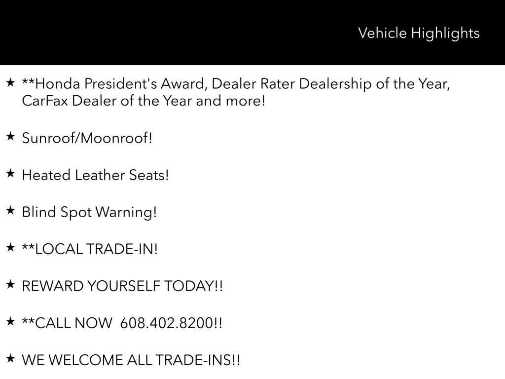 **Honda Presidents Award, Dealer Rater Dealership of the Year, CarFax Dealer of the Year and more!, Sunroof/Moonroof!, Heated Leather Seats!, Blind Spot Warning!, **LOCAL TRADE-IN!, REWARD YOURSELF TODAY!!, **CALL NOW 608.402.8200!!, WE WELCOME ALL TRADE-INS!!, **KBB Fair Trade sale, vehicle must be 2012 or newer and be in running condition., Besides many of the features just listed, this Honda CR-V also may have many of the following;, HondaTrue Used Certified, AWD, 18 Alloy Wheels, 4-Wheel Disc Brakes, 5.64 Axle Ratio, 8 Speakers, ABS brakes, Adaptive Cruise Control: Adaptive Cruise Control (ACC) with Low-Speed Follow, Air Conditioning, Alloy wheels, AM/FM radio: SiriusXM, Apple CarPlay/Android Auto, Auto High-beam Headlights, Auto-dimming Rear-View mirror, Automatic temperature control, Blind Spot Information (BSI) System warning, Brake assist, Bumpers: body-color, Compass, Delay-off headlights, Driver door bin, Driver vanity mirror, Dual front impact airbags, Dual front side impact airbags, Electronic Stability Control, Exterior Parking Camera Rear, Forward collision: Collision Mitigation Braking System (CMBS) + FCW mitigation, Four wheel independent suspension, Front anti-roll bar, Front Bucket Seats, Front Center Armrest, Front dual zone A/C, Front fog lights, Front reading lights, Garage door transmitter: HomeLink, Heated door mirrors, Heated Front Bucket Seats, Heated front seats, Illuminated entry, Leather Seat Trim, Leather Shift Knob, Low tire pressure warning, Memory seat, Occupant sensing airbag, Outside temperature display, Overhead airbag, Overhead console, Panic alarm, Passenger door bin, Passenger vanity mirror, Power door mirrors, Power driver seat, Power Liftgate, Power moonroof, Power passenger seat, Power steering, Power windows, Radio data system, Radio: 180-Watt AM/FM/HD/SiriusXM Audio System, Rear anti-roll bar, Rear seat center armrest, Rear window defroster, Rear window wiper, Remote keyless entry, Security system, Speed control, Speed-sensing steering, Speed-Sensitive Wipers, Split folding rear seat, Spoiler, Steering wheel mounted audio controls, Tachometer, Telescoping steering wheel, Tilt steering wheel, Traction control, Trip computer, Turn signal indicator mirrors, Variably intermittent wipers, AWD.