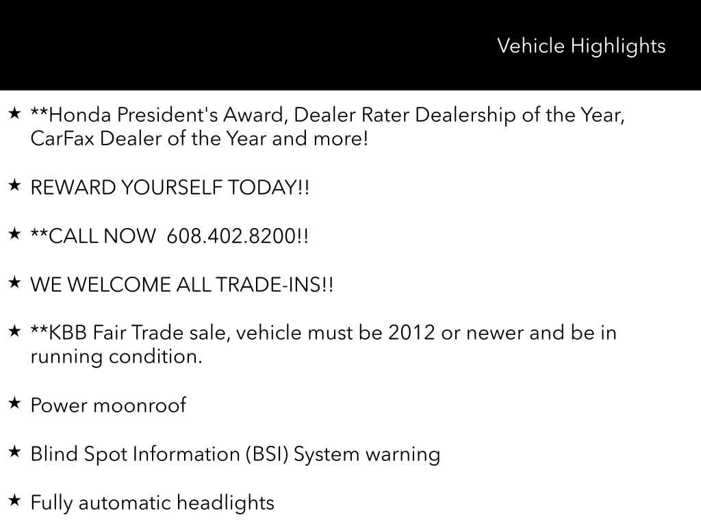 **Honda Presidents Award, Dealer Rater Dealership of the Year, CarFax Dealer of the Year and more!, REWARD YOURSELF TODAY!!, **CALL NOW 608.402.8200!!, WE WELCOME ALL TRADE-INS!!, **KBB Fair Trade sale, vehicle must be 2012 or newer and be in running condition., Besides many of the features just listed, this Honda Accord Hybrid also may have many of the following;, HondaTrue Certified Certified, 2.0L 4-Cylinder DOHC 16V i-VTEC, Blind Spot Information (BSI) System warning, Fully automatic headlights, Power moonroof, 17 Machine-Finished Alloy Wheels, 4-Wheel Disc Brakes, 8 Speakers, ABS brakes, Adaptive Cruise Control: Adaptive Cruise Control (ACC) with Low-Speed Follow, Air Conditioning, Alloy wheels, AM/FM radio: SiriusXM, Apple CarPlay/Android Auto, Auto High-beam Headlights, Automatic temperature control, Brake assist, Bumpers: body-color, Cloth Seat Trim, Delay-off headlights, Driver door bin, Driver vanity mirror, Dual front impact airbags, Dual front side impact airbags, Electronic Stability Control, Emergency communication system: HondaLink, Exterior Parking Camera Rear, Forward collision: Collision Mitigation Braking System (CMBS) + FCW mitigation, Four wheel independent suspension, Front anti-roll bar, Front Bucket Seats, Front Center Armrest, Front dual zone A/C, Front fog lights, Front reading lights, Heated door mirrors, Heated Front Bucket Seats, Heated front seats, Illuminated entry, Knee airbag, Lane Departure Warning System, Low tire pressure warning, Occupant sensing airbag, Outside temperature display, Overhead airbag, Overhead console, Panic alarm, Passenger door bin, Passenger vanity mirror, Power door mirrors, Power driver seat, Power steering, Power windows, Radio data system, Radio: 180-Watt AM/FM/HD Audio System, Rear anti-roll bar, Rear seat center armrest, Rear window defroster, Remote keyless entry, Security system, Speed control, Speed-sensing steering, Speed-Sensitive Wipers, Split folding rear seat, Steering wheel mounted audio controls, Telescoping steering wheel, Tilt steering wheel, Traction control, Trip computer, Variably intermittent wipers, 2.0L 4-Cylinder DOHC 16V i-VTEC, Blind Spot Information (BSI) System warning, Fully automatic headlights, Power moonroof.