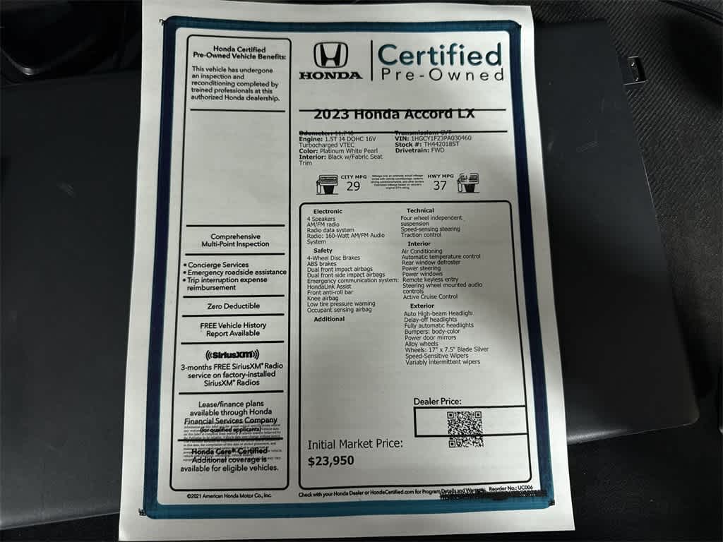 Certified. White 2023 Honda Accord LX FWD CVT 1.5T I4 DOHC 16V Turbocharged VTEC Black w/Fabric Seat Trim.