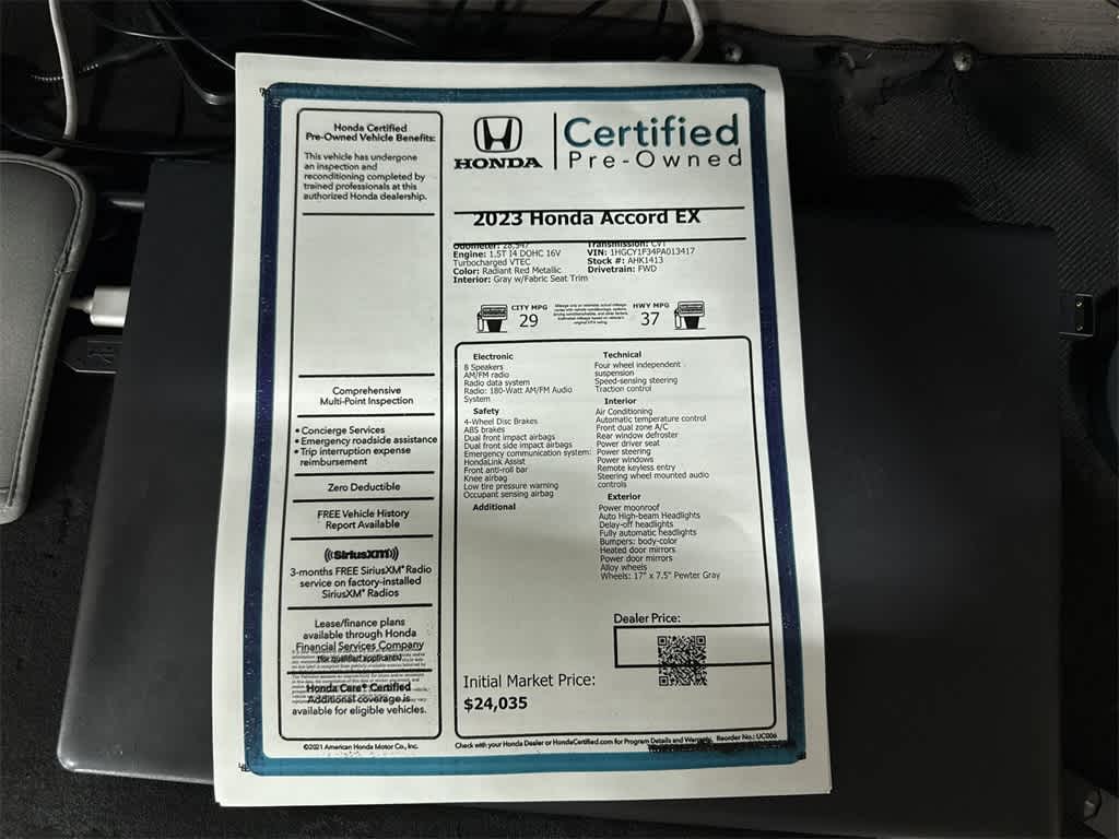 Certified. Red 2023 Honda Accord EX FWD CVT 1.5T I4 DOHC 16V Turbocharged VTEC Black w/Fabric Seat Trim.