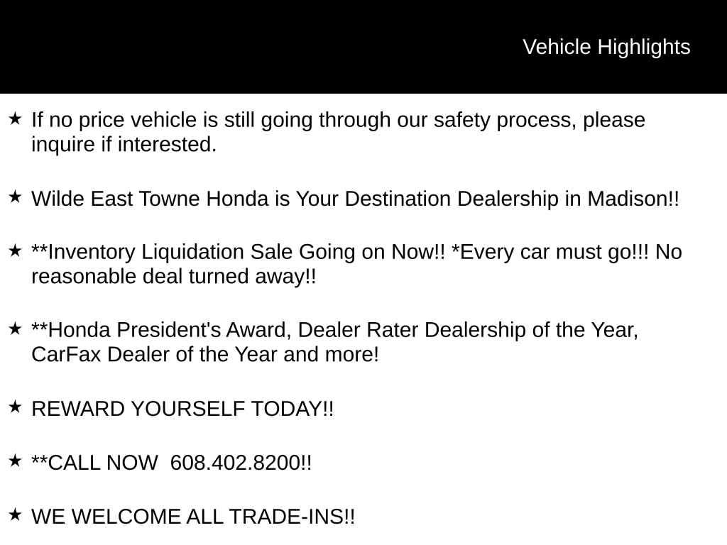 **Happy New Year!! Make your New Years Resolution to Spoil yourself with a New Car!!! To Celebrate were running $1000 over KBB Trade-in!! Stop in for your New or Used Honda, or anything in between and see why were Dealerrater Dealer of the Year! Honda Presidents Award Dealer, and Carfax Dealer of the year, come see for yourself why were rated one of Madisons Best and rated a 4.8/5 on 5000 reviews on Cars.com!!! Also Have Corporate discounts available, see a sales associate for details.