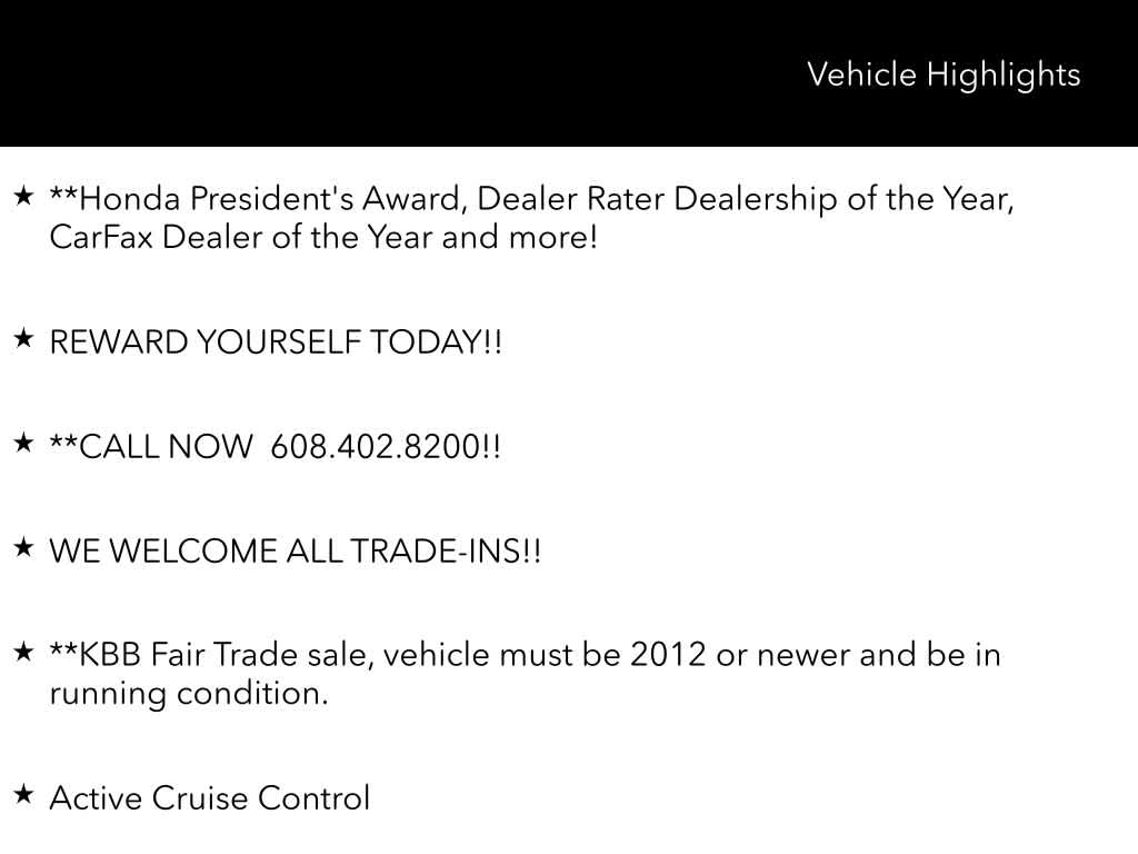 **Happy New Year!! Make your New Years Resolution to Spoil yourself with a New Car!!! To Celebrate were running $1000 over KBB Trade-in!! Stop in for your New or Used Honda, or anything in between and see why were Dealerrater Dealer of the Year! Honda Presidents Award Dealer, and Carfax Dealer of the year, come see for yourself why were rated one of Madisons Best and rated a 4.8/5 on 5000 reviews on Cars.com!!! Also Have Corporate discounts available, see a sales associate for details.