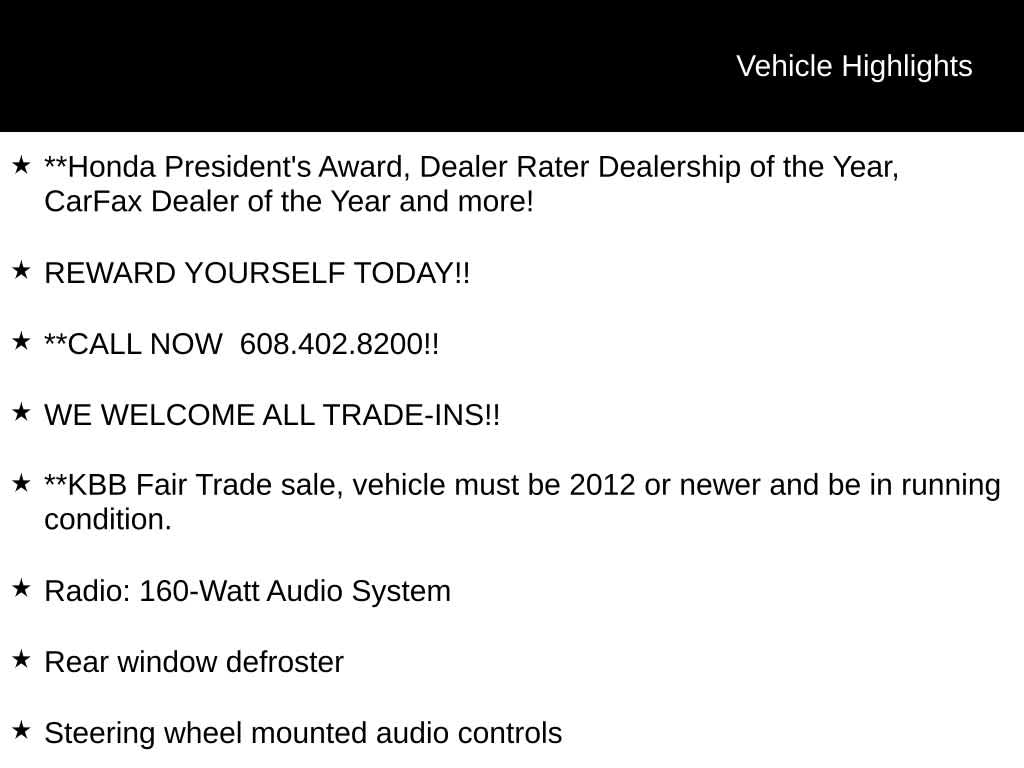**Happy New Year!! Make your New Years Resolution to Spoil yourself with a New Car!!! To Celebrate were running $1000 over KBB Trade-in!! Stop in for your New or Used Honda, or anything in between and see why were Dealerrater Dealer of the Year! Honda Presidents Award Dealer, and Carfax Dealer of the year, come see for yourself why were rated one of Madisons Best and rated a 4.8/5 on 5000 reviews on Cars.com!!! Also Have Corporate discounts available, see a sales associate for details.