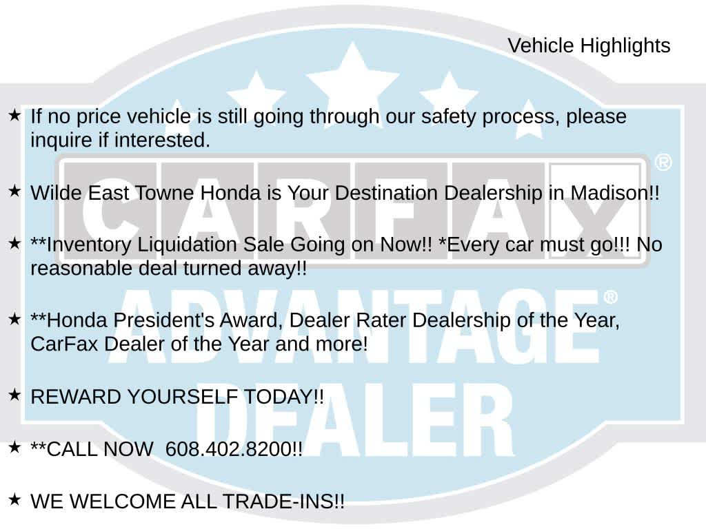 We would like to invite you out to Wilde East Towne Honda where you will experience a higher level of customer service. Exceptional service care that has helped us earn some prestigious awards. Honda President??s Award. Hondas highest level of achievement. DealerRater Dealer of the Year. Carfax customer service dealership of the year. Our family friendly staff look forward to serving all your automotive needs. Located on Madison??s East Side, we are just 2 miles South of Sun Prairie off Hwy 151/90/94. Some vehicles may be sub