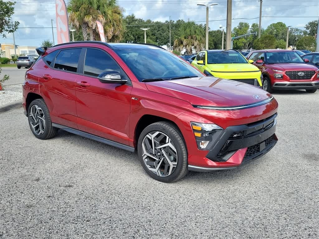 Clean CARFAX. Certified. Ultimate Red Metallic 2024 Hyundai Kona N Line **CERTIFIED**LOADED!!** AWD Automatic I4 24/29 City/Highway MPG **FAST AND FUN WITH STYLE**, **ONE OWNER**, **CLEAN CARFAX**, **ALL SERVICE RECORDS**, **CERTIFIED**, **MOONROOF / SUNROOF**, **LEATHER**, **NAVI / NAVIGATION /GPS**, **BACKUP CAMERA**, **APPLE CAR PLAY**, 3.510 Axle Ratio, 4-Wheel Disc Brakes, 8 Speakers, ABS brakes, Air Conditioning, Alloy wheels, AM/FM radio: SiriusXM, Apple CarPlay & Android Auto, Auto High-beam Headlights, Auto-dimming Rear-View mirror, Automatic temperature control, Brake assist, Bumpers: body-color, Cargo Net, Cargo Tray, Carpeted Floor Mats, Column-Mounted Shift-By-Wire, Delay-off headlights, Driver door bin, Driver vanity mirror, Dual front impact airbags, Dual front side impact airbags, Electronic Stability Control, Emergency communication system: Bluelink+, Exterior Parking Camera Rear, First Aid Kit, Four wheel independent suspension, Front anti-roll bar, Front Bucket Seats, Front Center Armrest, Front dual zone A/C, Front reading lights, Fully automatic headlights, Heated door mirrors, Heated front seats, Illuminated entry, Leather steering wheel, Low tire pressure warning, N-Line Alcantara Sport Combination Seat Trim, Navigation System, Occupant sensing airbag, Option Group 01, Outside temperature display, Overhead airbag, Panic alarm, Passenger door bin, Power door mirrors, Power driver seat, Power moonroof, Power steering, Power windows, Radio: AM/FM/HD Radio/SiriusXM Audio System, Rear anti-roll bar, Rear Bumper Applique, Rear seat center armrest, Rear window defroster, Rear window wiper, Remote keyless entry, Security system, Speed control, Speed-sensing steering, Split folding rear seat, Spoiler, Steering wheel mounted audio controls, Tachometer, Telescoping steering wheel, Tilt steering wheel, Traction control, Trip computer, Turn signal indicator mirrors, Variably intermittent wipers, Wheels: 19 x 7.5J Metallic Alloy.