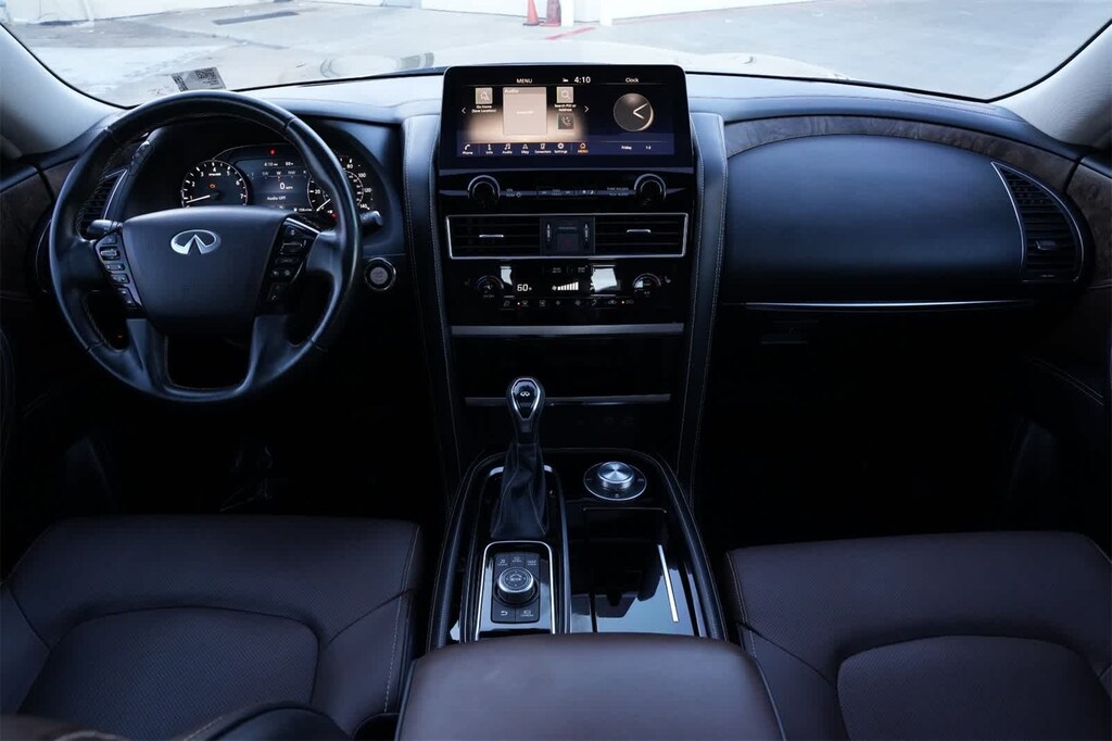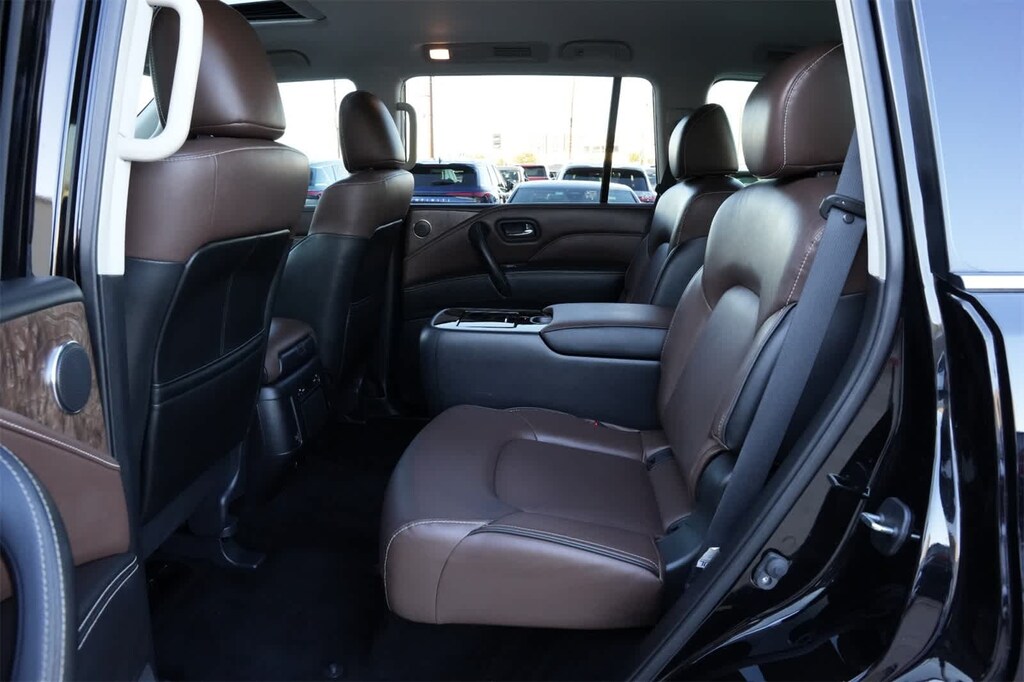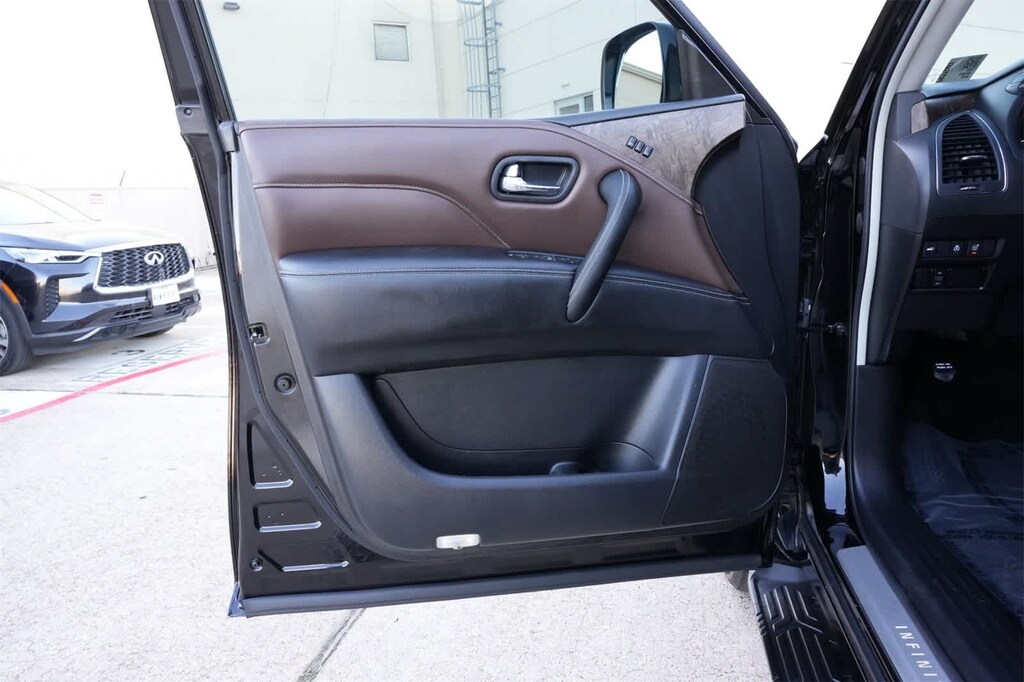 INFINITI Certified Pre-Owned Certified, 13 Speakers, 2.937 Axle Ratio, 3rd row seats: split-bench, 4-Wheel Disc Brakes, ABS brakes, Air Conditioning, Alloy wheels, AM/FM radio: SiriusXM, Anti-whiplash front head restraints, Auto High-beam Headlights, Auto tilt-away steering wheel, Auto-dimming door mirrors, Auto-dimming Rear-View mirror, Auto-leveling suspension, Automatic temperature control, Brake assist, Bumpers: body-color, Cargo Net, Cargo Package, Carpeted Cargo Mat, Center Console Tray, Compass, Console Net, Delay-off headlights, Driver door bin, Driver vanity mirror, Dual front impact airbags, Dual front side impact airbags, Electronic Stability Control, Emergency communication system: INFINITI InTouch, First-Aid Kit, Four wheel independent suspension, Front anti-roll bar, Front Bucket Seats, Front Center Armrest, Front dual zone A/C, Front fog lights, Front reading lights, Fully automatic headlights, Garage door transmitter: HomeLink, Heated door mirrors, Heated Front Bucket Seats, Heated front seats, Heated steering wheel, Illuminated entry, INFINITI Radiant Illuminated Kick Plates, Leather Shift Knob, Leather steering wheel, Leather-Appointed Seats, Literature Kit, Low tire pressure warning, Memory seat, Midyear Change, Navigation system: INFINITI InTouch Navigation, Occupant sensing airbag, Outside temperature display, Overhead airbag, Overhead console, Panic alarm, Passenger door bin, Passenger vanity mirror, Power door mirrors, Power driver seat, Power Liftgate, Power moonroof, Power passenger seat, Power steering, Power windows, Premium audio system: Bose, Premium Select Truffle Brown Interior, Radio data system, Radio: Bose Premium Audio System w/13 Speakers, Rain sensing wipers, Rear air conditioning, Rear anti-roll bar, Rear reading lights, Rear seat center armrest, Rear window defroster, Rear window wiper, Reclining 3rd row seat, Remote keyless entry, Roof Rail Cross Bars, Security system, Speed control, Speed-sensing steering, Split folding rear seat, Spoiler, Steering wheel memory, Steering wheel mounted audio controls, Tachometer, Telescoping steering wheel, Tilt steering wheel, Traction control, Trip computer, Turn signal indicator mirrors, Variably intermittent wipers, Voltmeter, Wheels: 22 x 8.0 Dark Chrome Cast Aluminum-Alloy.