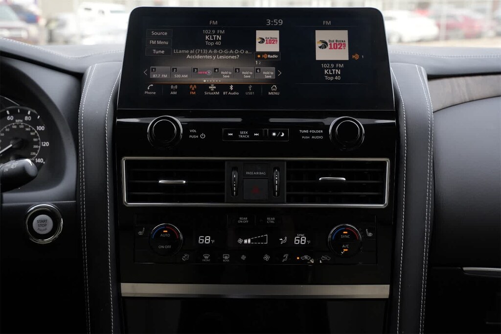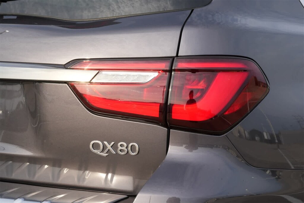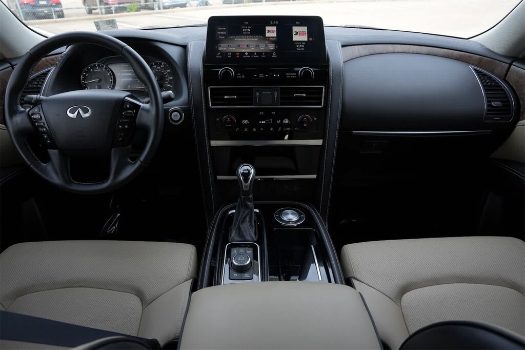INFINITI Certified Pre-Owned Certified, 13 Speakers, 2.937 Axle Ratio, 3rd row seats: bench, 4-Wheel Disc Brakes, ABS brakes, Air Conditioning, Alloy wheels, AM/FM radio: SiriusXM, Anti-whiplash front head restraints, Apple CarPlay/Android Auto, Auto High-beam Headlights, Auto tilt-away steering wheel, Auto-dimming door mirrors, Auto-dimming Rear-View mirror, Auto-leveling suspension, Automatic temperature control, Brake assist, Bumpers: body-color, Cargo Package, Compass, Console Net, Delay-off headlights, Driver door bin, Driver vanity mirror, Dual front impact airbags, Dual front side impact airbags, Electronic Stability Control, Emergency communication system: INFINITI InTouch, First-Aid Kit, Four wheel independent suspension, Front anti-roll bar, Front Bucket Seats, Front Center Armrest, Front dual zone A/C, Front fog lights, Front reading lights, Fully automatic headlights, Garage door transmitter: HomeLink, Heated door mirrors, Heated Front Bucket Seats, Heated front seats, Heated steering wheel, Illuminated entry, Leather Shift Knob, Leather steering wheel, Leather-Appointed Seats, Literature Kit, Low tire pressure warning, Memory seat, Moisture-Resistant Rear Cargo Carpet, Navigation system: INFINITI InTouch Navigation, Nylon-Cord Cargo Net, Occupant sensing airbag, Outside temperature display, Overhead airbag, Overhead console, Panic alarm, Passenger door bin, Passenger vanity mirror, Power door mirrors, Power driver seat, Power Liftgate, Power moonroof, Power passenger seat, Power steering, Power windows, Premium Select Sahara Stone Interior, Radio data system, Radio: Bose Premium Audio System w/13 Speakers, Rain sensing wipers, Rear air conditioning, Rear anti-roll bar, Rear reading lights, Rear seat center armrest, Rear window defroster, Rear window wiper, Reclining 3rd row seat, Remote keyless entry, Roof Rail Cross Bars, Security system, Speed control, Speed-sensing steering, Split folding rear seat, Spoiler, Steering wheel memory, Steering wheel mounted audio controls, Tachometer, Telescoping steering wheel, Tilt steering wheel, Traction control, Trip computer, Turn signal indicator mirrors, Variably intermittent wipers, Voltmeter, Wheels: 22 Dark Chrome Cast Aluminum-Alloy.