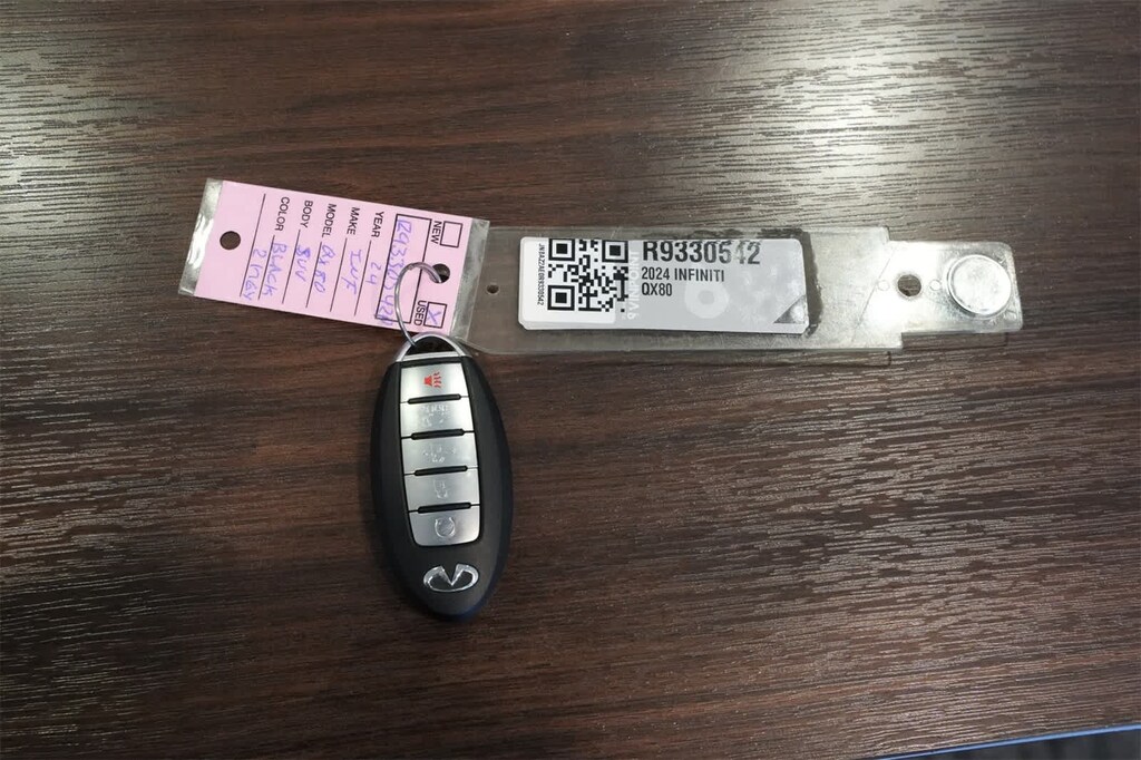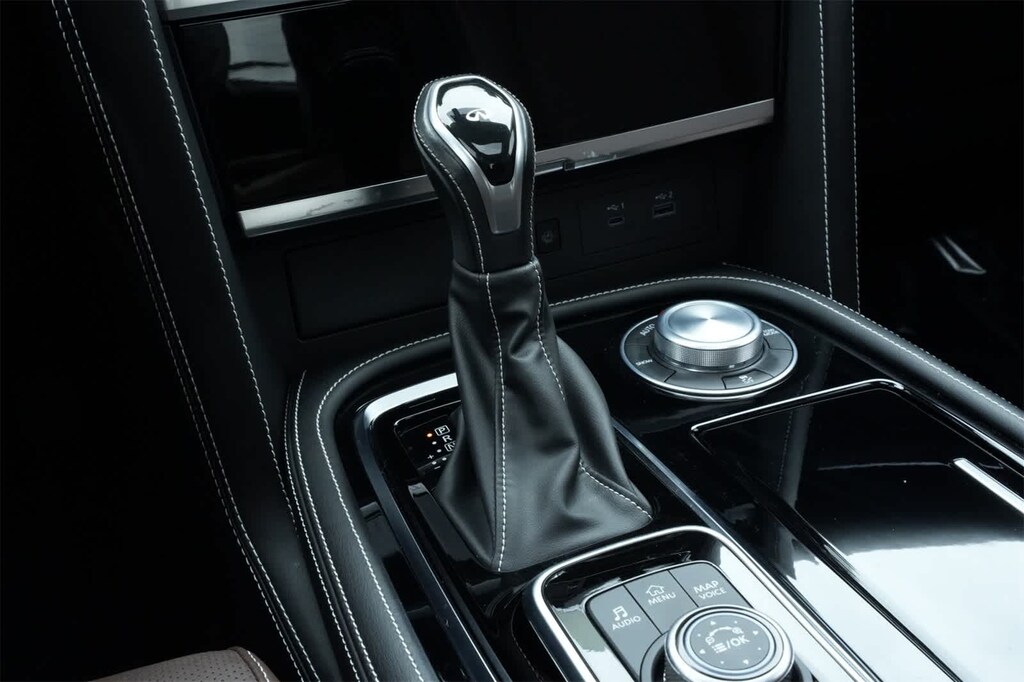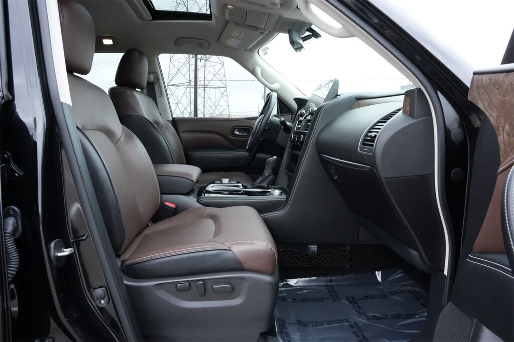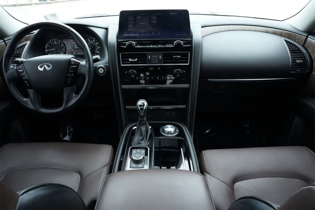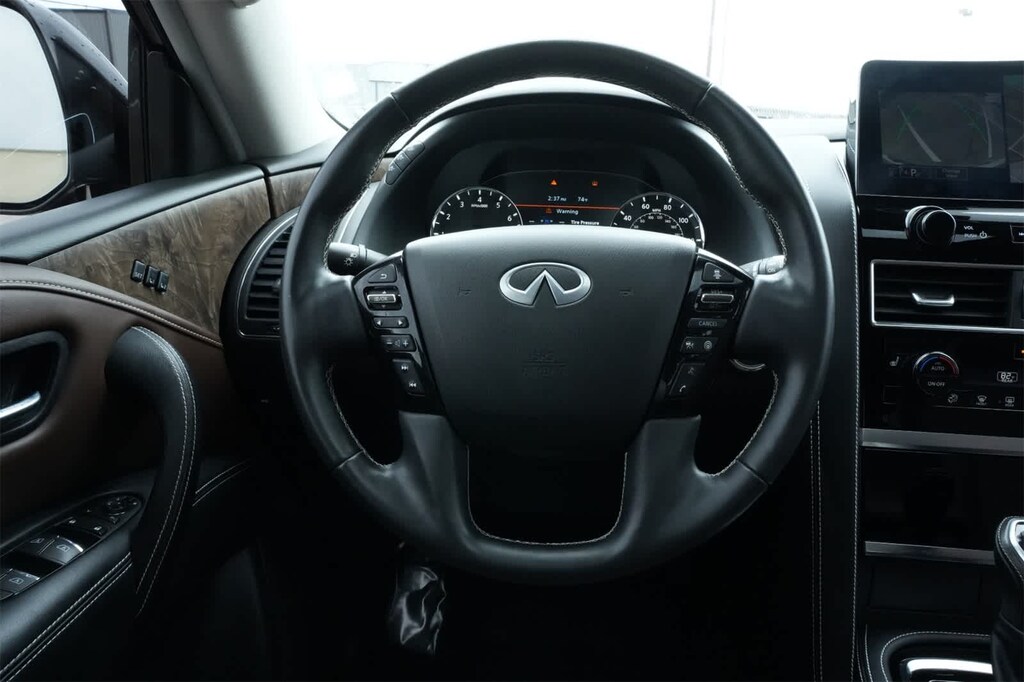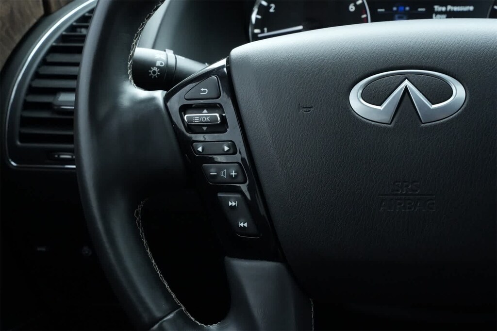 INFINITI Certified Pre-Owned Certified, 13 Speakers, 2.937 Axle Ratio, 3rd row seats: bench, 4-Wheel Disc Brakes, ABS brakes, Air Conditioning, Alloy wheels, AM/FM radio: SiriusXM, Anti-whiplash front head restraints, Apple CarPlay/Android Auto, Auto High-beam Headlights, Auto tilt-away steering wheel, Auto-dimming door mirrors, Auto-dimming Rear-View mirror, Auto-leveling suspension, Automatic temperature control, Brake assist, Bumpers: body-color, Cargo Package, Compass, Console Net, Delay-off headlights, Driver door bin, Driver vanity mirror, Dual front impact airbags, Dual front side impact airbags, Electronic Stability Control, Emergency communication system: INFINITI InTouch, First-Aid Kit, Four wheel independent suspension, Front anti-roll bar, Front Bucket Seats, Front Center Armrest, Front dual zone A/C, Front fog lights, Front reading lights, Fully automatic headlights, Garage door transmitter: HomeLink, Heated door mirrors, Heated Front Bucket Seats, Heated front seats, Heated steering wheel, Illuminated entry, Leather Shift Knob, Leather steering wheel, Leather-Appointed Seats, Literature Kit, Low tire pressure warning, Memory seat, Moisture-Resistant Rear Cargo Carpet, Navigation system: INFINITI InTouch Navigation, Nylon-Cord Cargo Net, Occupant sensing airbag, Outside temperature display, Overhead airbag, Overhead console, Panic alarm, Passenger door bin, Passenger vanity mirror, Power door mirrors, Power driver seat, Power Liftgate, Power moonroof, Power passenger seat, Power steering, Power windows, Premium Select Truffle Brown Interior, Radio data system, Radio: Bose Premium Audio System w/13 Speakers, Rain sensing wipers, Rear air conditioning, Rear anti-roll bar, Rear reading lights, Rear seat center armrest, Rear window defroster, Rear window wiper, Reclining 3rd row seat, Remote keyless entry, Roof Rail Cross Bars, Security system, Speed control, Speed-sensing steering, Split folding rear seat, Spoiler, Steering wheel memory, Steering wheel mounted audio controls, Tachometer, Telescoping steering wheel, Tilt steering wheel, Traction control, Trip computer, Turn signal indicator mirrors, Variably intermittent wipers, Voltmeter, Wheels: 22 Dark Chrome Cast Aluminum-Alloy.