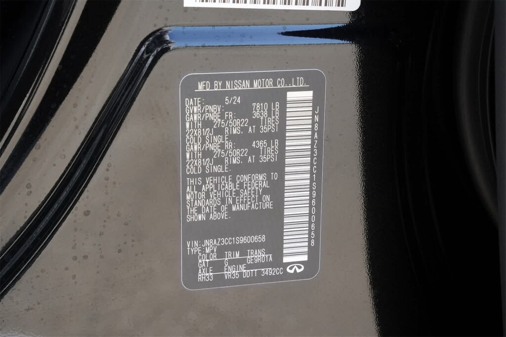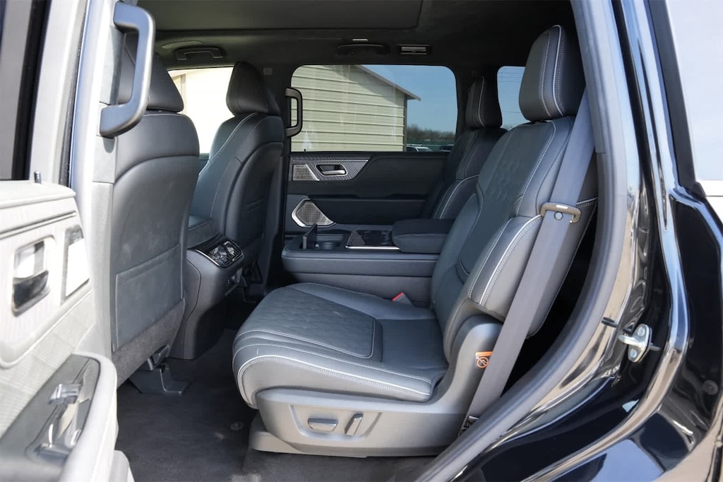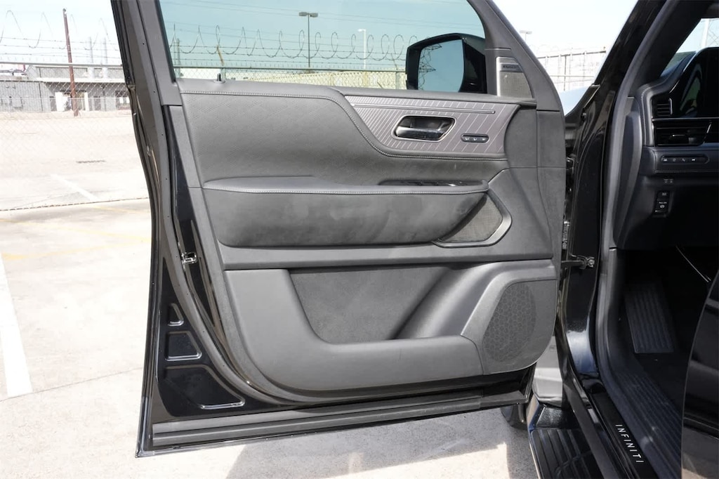 Certified Pre-Owned Select Certified, 3rd row seats: bench, 4-Wheel Disc Brakes, ABS brakes, Adaptive suspension, Air Conditioning, Alloy wheels, AM/FM radio: SiriusXM with 360L, Anti-whiplash front head restraints, Apple CarPlay/Android Auto, Audio memory, Auto High-beam Headlights, Auto tilt-away steering wheel, Auto-dimming door mirrors, Auto-dimming Rear-View mirror, Auto-leveling suspension, AUTOGRAPH Exterior Package, Automatic temperature control, Black Interior Lighting Package, Brake assist, Bumpers: body-color, Cargo Blocks, Center Front Spoiler, Climate Controlled Front Bucket Seats w/Massage, Compass, Console Net, Dark Matte Rear Bumper Protector, Delay-off headlights, Driver door bin, Driver vanity mirror, Dual front impact airbags, Dual front side impact airbags, Electronic Stability Control, Emergency communication system: INFINITI InTouch, Four wheel independent suspension, Front anti-roll bar, Front Bucket Seats, Front Center Armrest, Front dual zone A/C, Front reading lights, Fully automatic headlights, Garage door transmitter: myQ Connected Garage, Genuine wood dashboard insert, Genuine wood door panel insert, Heads-Up Display, Heated door mirrors, Heated front seats, Heated rear seats, Heated steering wheel, HVAC memory, Illuminated entry, INFINITI Radiant Black Cargo Scuff Plates, Knee airbag, Leather steering wheel, Literature Kit, Low tire pressure warning, Memory seat, Navigation system: Google Built-in, Occupant sensing airbag, Outside temperature display, Overhead airbag, Overhead console, Panic alarm, Panoramic Illuminated Headliner, Passenger door bin, Passenger vanity mirror, Power door mirrors, Power driver seat, Power Liftgate, Power moonroof, Power passenger seat, Power steering, Power windows, Premium Cargo Package, Premium Paint, Radio data system, Radio: Klipsch Reference Premiere Audio System, Rain sensing wipers, Rear air conditioning, Rear anti-roll bar, Rear reading lights, Rear seat center armrest, Rear window defroster, Rear window wiper, Reclining 3rd row seat, Remote keyless entry, Reversible Cargo Mat, Security system, Semi-Aniline Premium Leather Seating Surfaces, Silver Cross Bars, Smart Luggage Shelf, Soft Sided Cooler, Speed control, Speed-sensing steering, Splash Guards, Split folding rear seat, Spoiler, Steering wheel memory, Steering wheel mounted audio controls, Tachometer, Telescoping steering wheel, Tilt steering wheel, Traction control, Trip computer, Turn signal indicator mirrors, Umbrella Holder, Variably intermittent wipers, Ventilated front seats, Ventilated rear seats, Wheels: 22 x 8 Cast Aluminum Alloy.
