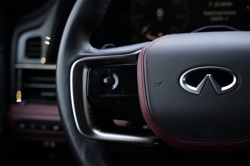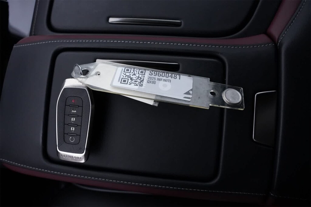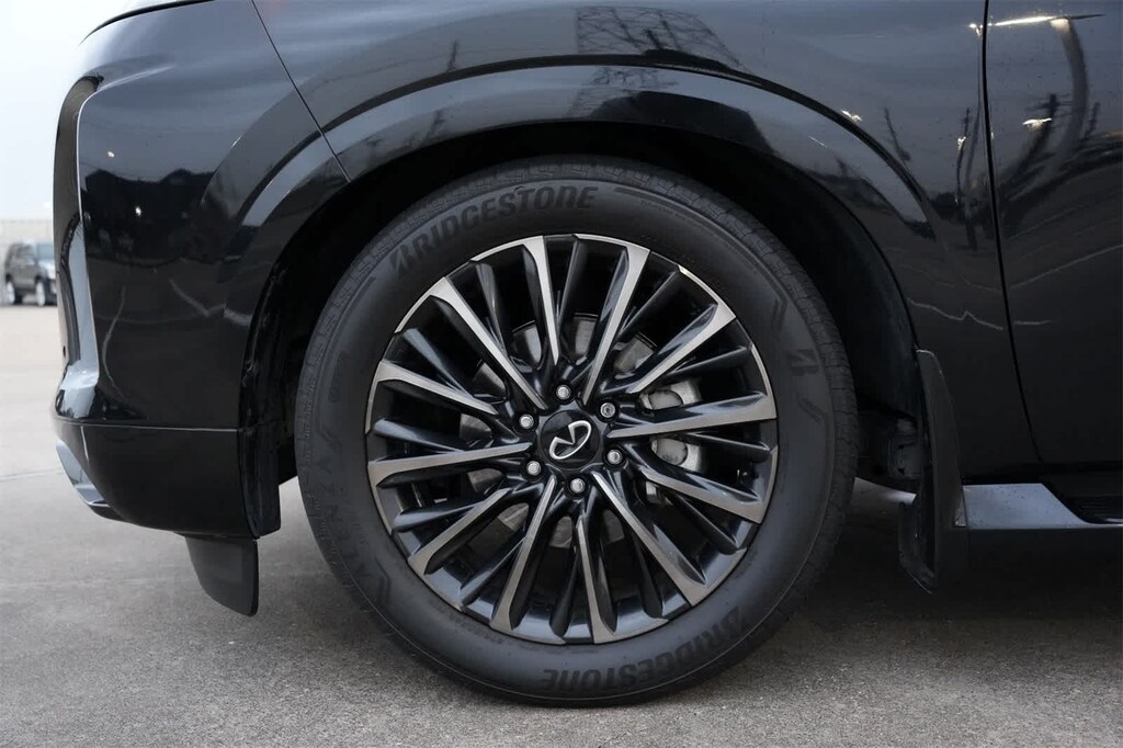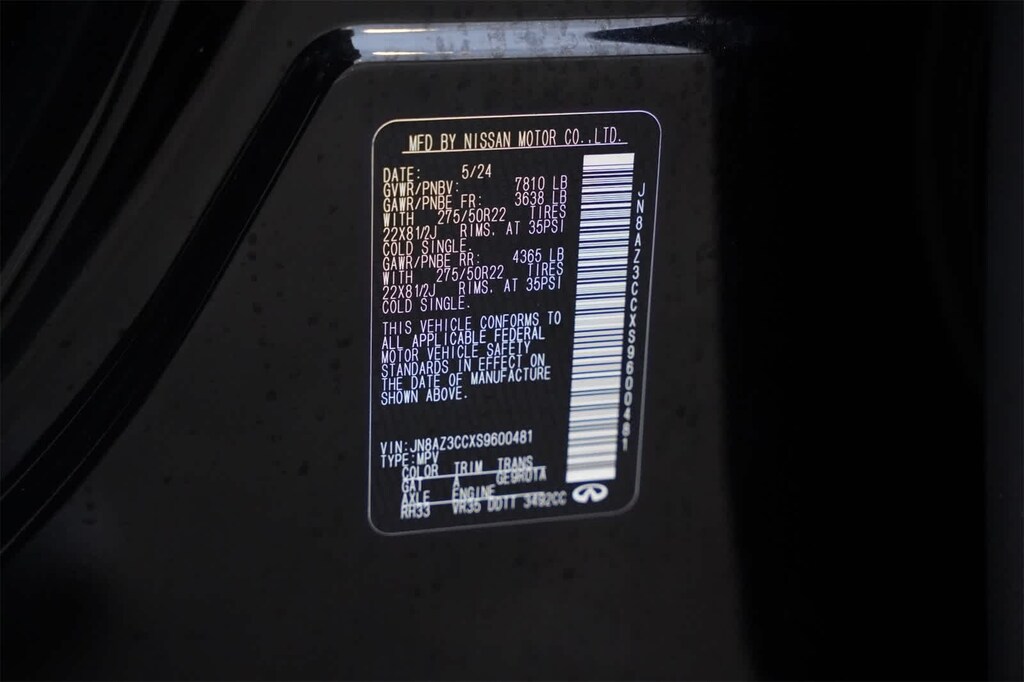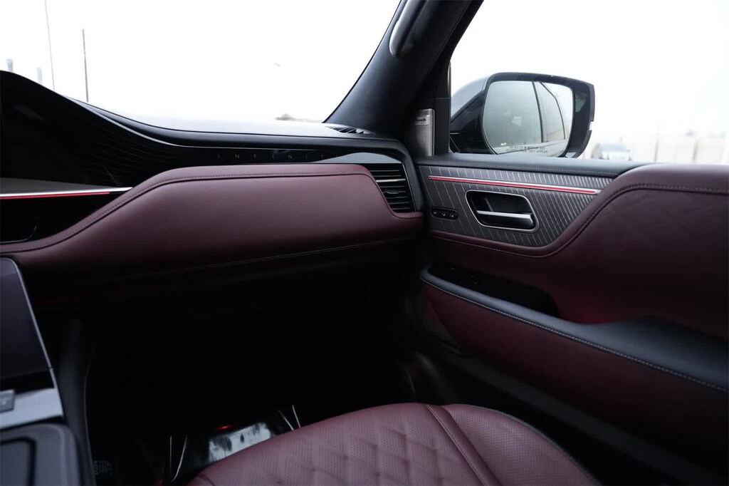 INFINITI Certified Pre-Owned Certified, 3rd row seats: bench, 4-Wheel Disc Brakes, ABS brakes, Adaptive suspension, Air Conditioning, Alloy wheels, AM/FM radio: SiriusXM with 360L, Anti-whiplash front head restraints, Apple CarPlay/Android Auto, Audio memory, Auto High-beam Headlights, Auto tilt-away steering wheel, Auto-dimming door mirrors, Auto-dimming Rear-View mirror, Auto-leveling suspension, AUTOGRAPH Exterior Package, Automatic temperature control, Black Interior Lighting Package, Brake assist, Bumpers: body-color, Cargo Blocks, Center Front Spoiler, Climate Controlled Front Bucket Seats w/Massage, Compass, Console Net, Dark Matte Rear Bumper Protector, Delay-off headlights, Driver door bin, Driver vanity mirror, Dual front impact airbags, Dual front side impact airbags, Electronic Stability Control, Emergency communication system: INFINITI InTouch, Four wheel independent suspension, Front anti-roll bar, Front Bucket Seats, Front Center Armrest, Front dual zone A/C, Front reading lights, Fully automatic headlights, Garage door transmitter: myQ Connected Garage, Genuine wood dashboard insert, Genuine wood door panel insert, Heads-Up Display, Heated door mirrors, Heated front seats, Heated rear seats, Heated steering wheel, HVAC memory, Illuminated entry, INFINITI Radiant Black Cargo Scuff Plates, Knee airbag, Leather steering wheel, Literature Kit, Low tire pressure warning, Memory seat, Navigation system: Google Built-in, Occupant sensing airbag, Outside temperature display, Overhead airbag, Overhead console, Panic alarm, Panoramic Illuminated Headliner, Passenger door bin, Passenger vanity mirror, Power door mirrors, Power driver seat, Power Liftgate, Power moonroof, Power passenger seat, Power steering, Power windows, Premium Cargo Package, Premium Paint, Radio data system, Radio: Klipsch Reference Premiere Audio System, Rain sensing wipers, Rear air conditioning, Rear anti-roll bar, Rear reading lights, Rear seat center armrest, Rear window defroster, Rear window wiper, Reclining 3rd row seat, Remote keyless entry, Reversible Cargo Mat, Security system, Semi-Aniline Premium Leather Seating Surfaces, Silver Cross Bars, Smart Luggage Shelf, Soft Sided Cooler, Speed control, Speed-sensing steering, Splash Guards, Split folding rear seat, Spoiler, Steering wheel memory, Steering wheel mounted audio controls, Tachometer, Telescoping steering wheel, Tilt steering wheel, Traction control, Trip computer, Turn signal indicator mirrors, Umbrella Holder, Variably intermittent wipers, Ventilated front seats, Ventilated rear seats, Wheels: 22 x 8 Cast Aluminum Alloy.