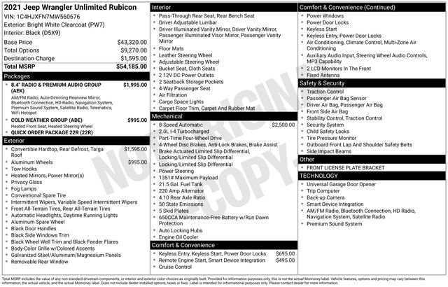 This 2021 Jeep Wrangler Unlimited Rubicon 4x4 is a highly capable and adventure-ready SUV that's built to explore. Powered by a 2.0L turbocharged inline-4 engine paired with an 8-speed automatic transmission and four-wheel drive, it delivers confident performance both on-road and off-trail with the rugged capability you expect from a Rubicon.