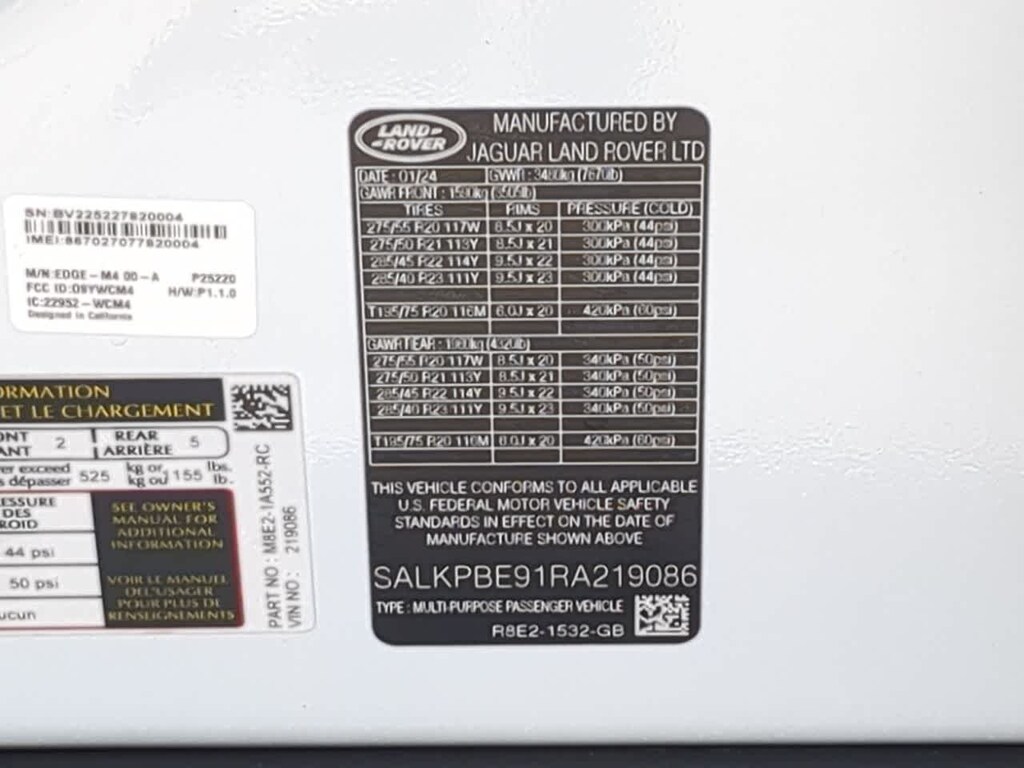 CARFAX One-Owner. Odometer is 3806 miles below market average! **LAND ROVER CERTIFIED**, 460CF - Range Rover 4.4 Litre T/C Petrol MHEV AWD Auto 5 Door Auto 530PS SE 7 Seats 0.00 0.00 017HE - Premium Upgrade Interior Pack 2,165.00 032AG - 23 Style 1075 Gloss Black 3,000.00 032NR - SV Bespoke Wood and Leather Steering Wheel 550.00 032XX - Shadow Exterior Pack 1,000.00 047EB - Solar attenuating windscreen 0.00 064QW - Pixel LED headlights with signature DRL 550.00 082ZZ - Volume Build Phase 0.00 088EH - Gloss Grand Black veneer 1,300.00 129AW - 11.4 Rear Seat Entertainment 3,150.00 1AA - Fuji White 0.00 301TJ - Ebony perforated Windsor leather seats with Perlino interior 0.00 RR071 - Premium Interior Protection & Storage Pack 725.00.