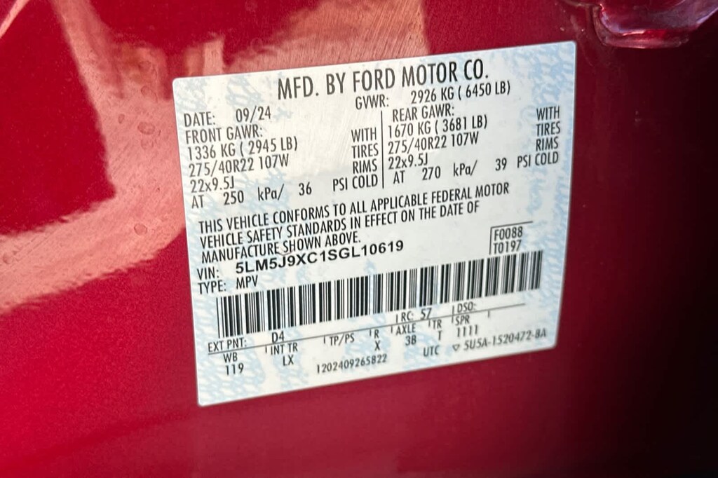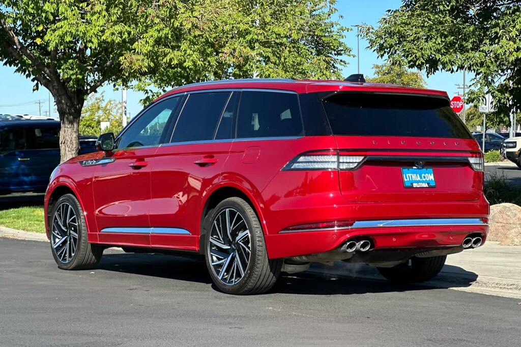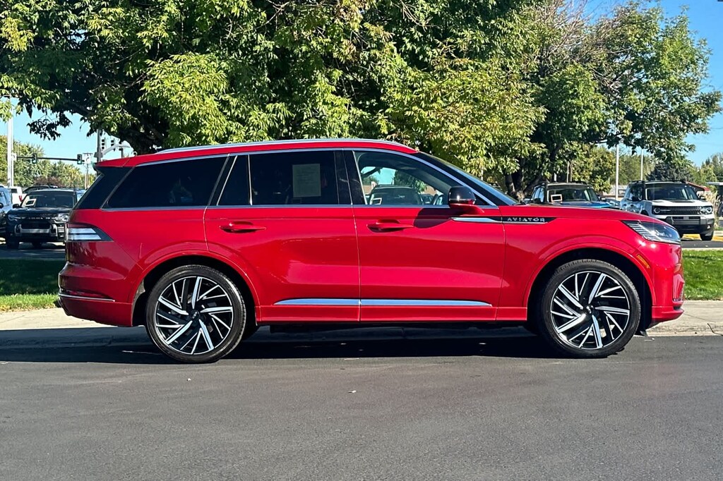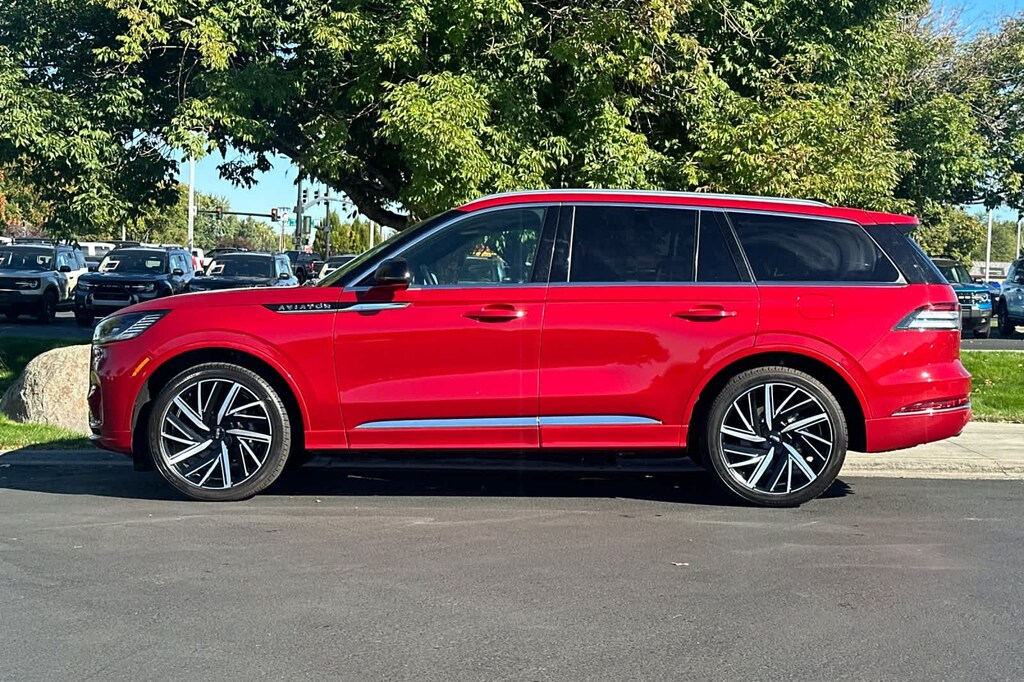 WHEELS: 22 EBONY BLACK BRIGHT-MACHINED adaptive suspension, Note: Adaptive suspension includes noise reduction module and sound insulation pack, TRANSMISSION: 10-SPEED AUTOMATIC W/SELECTSHIFT (STD). 2025 Lincoln Aviator with Red Carpet Metallic Tinted Clearcoat exterior and Ebony interior features a V6 Cylinder Engine with 400 HP at 5500 RPM*.