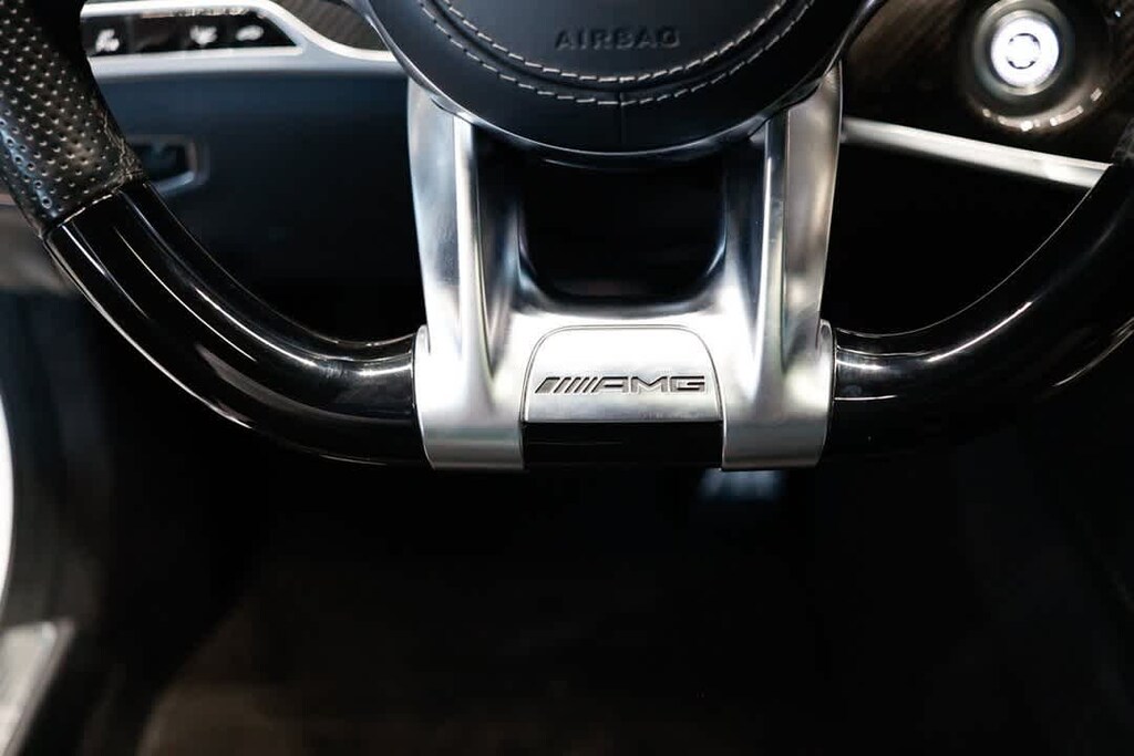 Inside, the experience is pure flagship luxury. The designo Exclusive interior surrounds you with rich leather, Black DINAMICA headliner, AMG carbon fiber accents, and piano black trim. The Burmester surround sound system delivers concert-level clarity, while the Head-Up Display keeps critical information floating effortlessly in your line of sight. The panoramic sunroof floods the cabin with light, reinforcing the open, first-class atmosphere.