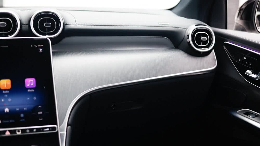 The AMG Line Package gives this GLC a completely different attitude, adding AMG body styling, flared wheel arches, sport seats, a multifunction AMG steering wheel, sport brakes with Mercedes-Benz lettering, AMG floor mats, and 19-inch AMG five-spoke wheels with black accents. The Night Package sharpens the look further with black exterior details and a black headliner, creating a bold, athletic stance that stands out immediately.