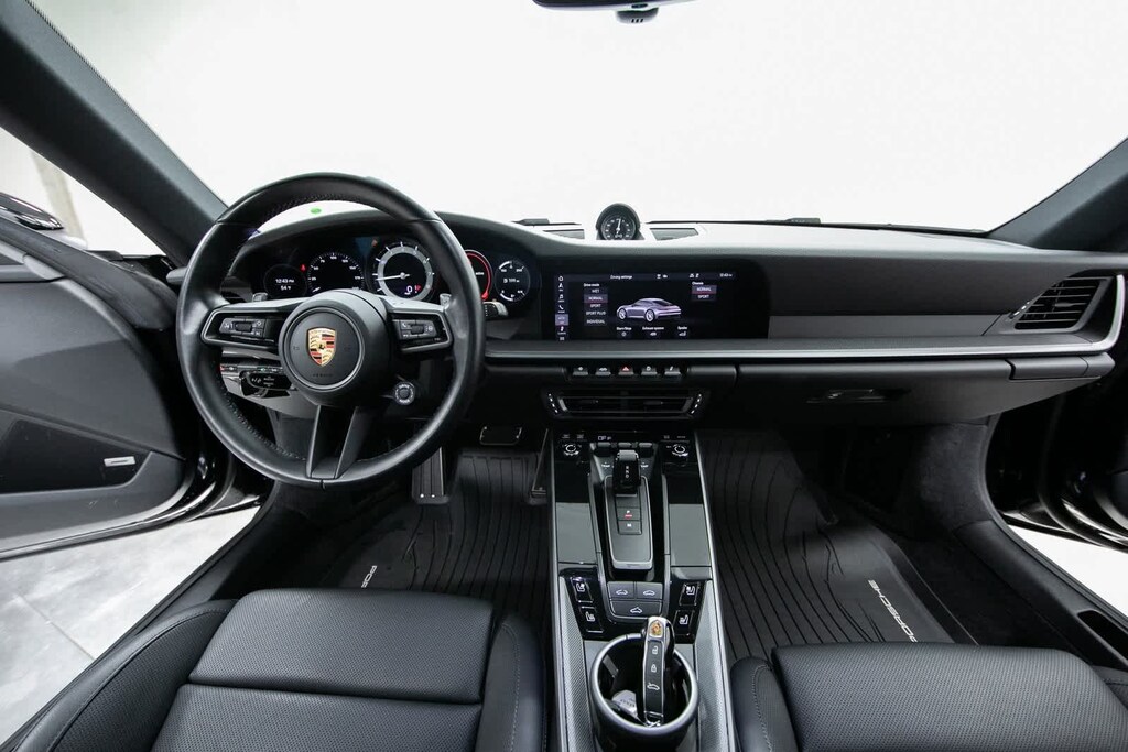Porsche Certified, 4-Way Sport Seats, 4-Wheel Disc Brakes, 8 Speakers, ABS brakes, Adaptive suspension, Air Conditioning, Alloy wheels, Apple CarPlay, Auto-dimming door mirrors, Auto-dimming Rear-View mirror, Automatic temperature control, Brake assist, Bumpers: body-color, Delay-off headlights, Driver door bin, Driver vanity mirror, Dual front impact airbags, Dual front side impact airbags, Electronic Stability Control, Exterior Parking Camera Rear, Four wheel independent suspension, Front anti-roll bar, Front Bucket Seats, Front Center Armrest, Front dual zone A/C, Front reading lights, Fully automatic headlights, Garage door transmitter: HomeLink, Heated door mirrors, Heated front seats, Illuminated entry, Leather Seat Trim, Leather steering wheel, Low tire pressure warning, Navigation system: Porsche Communication Management (PCM), Occupant sensing airbag, Outside temperature display, Overhead airbag, Overhead console, Passenger door bin, Passenger vanity mirror, Porsche Communication Management, Power door mirrors, Power driver seat, Power passenger seat, Power steering, Power windows, Radio data system, Rain sensing wipers, Rear anti-roll bar, Rear fog lights, Rear window defroster, Remote keyless entry, Security system, Speed control, Split folding rear seat, Spoiler, Sport steering wheel, Steering wheel mounted audio controls, Tachometer, Telescoping steering wheel, Tilt steering wheel, Traction control, Trip computer, Variably intermittent wipers, Wheels: 19 Front/20 Rear Carrera. Odometer is 2878 miles below market average! Black 2021 Porsche 911 Carrera Carrera RWD 8-Speed Porsche Doppelkupplung (PDK) 3.0L H6 Turbocharged DOHC 24V LEV3-ULEV70 379hp