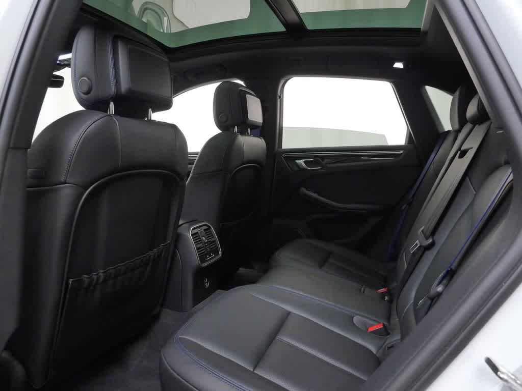 This 2023 Porsche Macan T is finished in White over a Black leather interior with Gentian Blue deviated stitching, creating a sharp, sport-focused look with unique interior contrast.