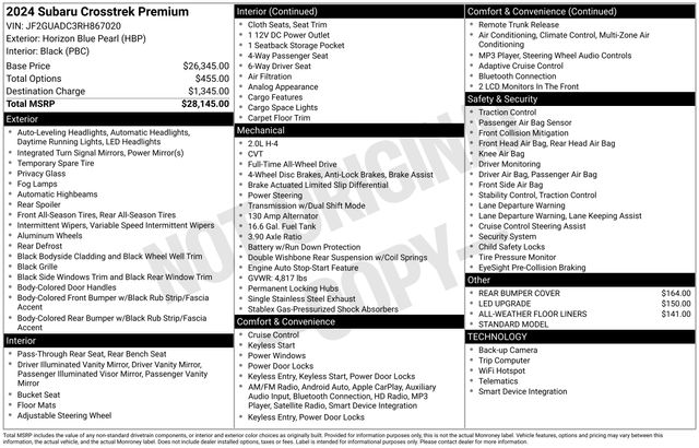 Beneath the sleek exterior, the Crosstrek Premium is powered by a 2.0L 4-Cylinder DOHC 16V engine, delivering a smooth and efficient driving experience with its Lineartronic CVT and standard Symmetrical All-Wheel Drive. With an EPA-estimated 27 MPG in the city and 34 MPG on the highway, this Subaru offers impressive fuel efficiency to complement its adventurous spirit.