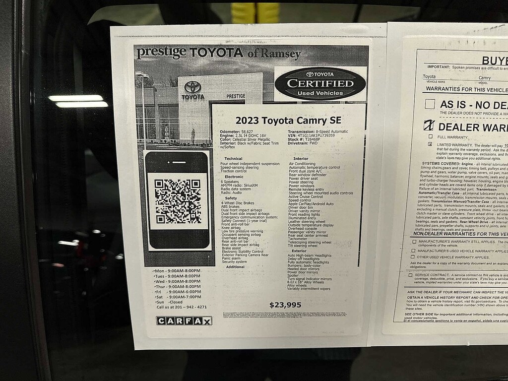 4D Sedan, 2.5L I4 DOHC 16V, 8-Speed Automatic, FWD, Celestial Silver Metallic, Black w/Fabric Seat Trim w/Softex, ABS brakes, Active Cruise Control, Alloy wheels, Electronic Stability Control, Front dual zone A/C, Heated door mirrors, Illuminated entry, Low tire pressure warning, Remote keyless entry, Traction control. Clean CARFAX. CARFAX One-Owner. Certified. Celestial Silver Metallic 2023 Toyota Camry SE FWD 8-Speed Automatic 2.5L I4 DOHC 16V