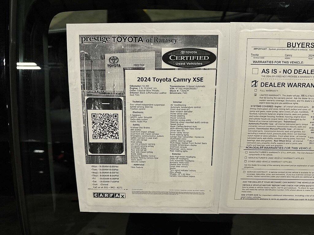 Camry XSE, 4D Sedan, 2.5L I4 DOHC 16V, 8-Speed Automatic, FWD, Celestial Silver Metallic, Black w/Perforated Leather Seat Trim. Clean CARFAX. CARFAX One-Owner. Certified. Celestial Silver Metallic 2024 Toyota Camry XSE FWD 8-Speed Automatic 2.5L I4 DOHC 16V