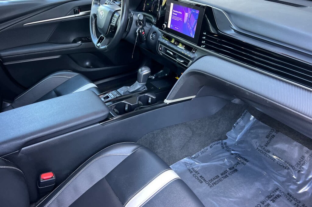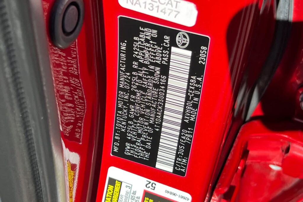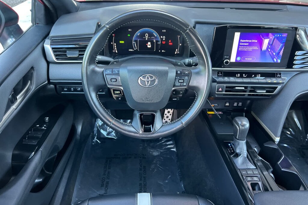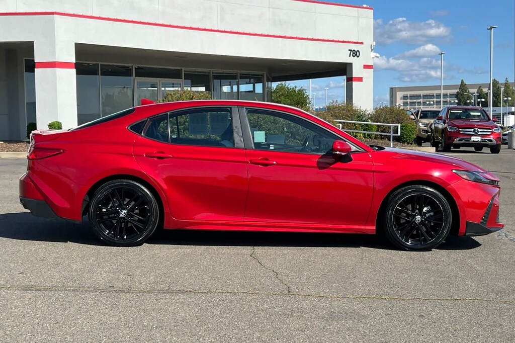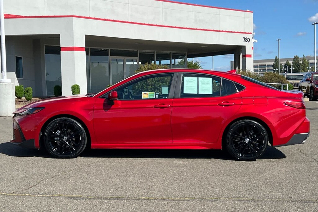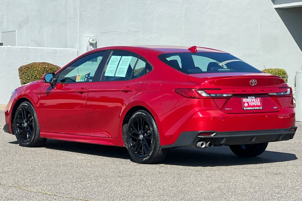 Certified. Red 2025 Toyota Camry SE FWD eCVT 2.5L 4-Cylinder 16V DOHC 2.5L 4-Cylinder 16V DOHC, Black Premium Synthetic, ABS brakes, Active Cruise Control, Alloy wheels, Electronic Stability Control, Front dual zone A/C, Heated door mirrors, Illuminated entry, Low tire pressure warning, Remote keyless entry, Traction control.