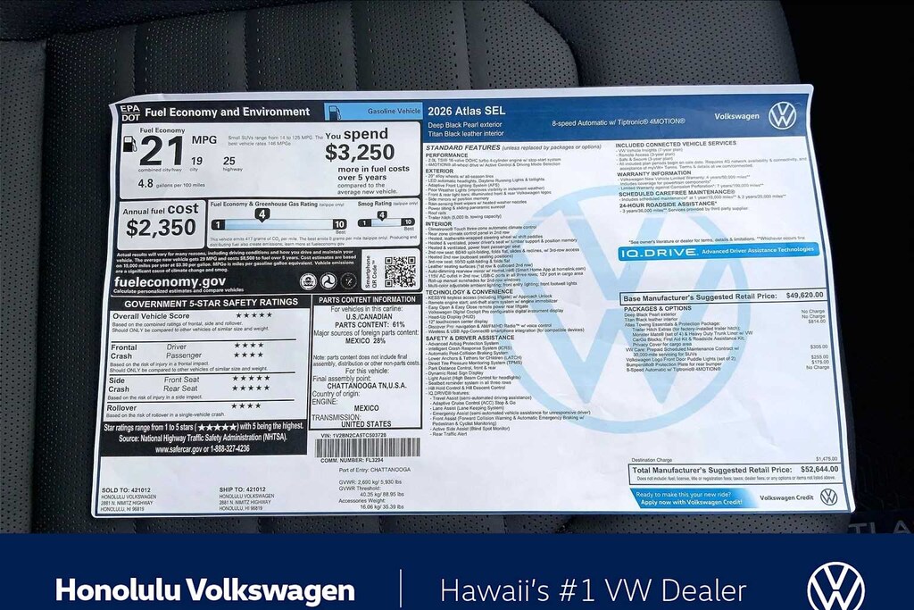 Get to know your Premier Honolulu Volkswagen Dealership, Selling New and Pre-Owned used vehicles in; Waianae, Kapolei, Ewa Beach, Waipahu, Waikele, Pearl City, Hawaii, Kai, Aiea, Mililani, Haleiwa, Honolulu, Waimanalo, Kailua, Kaneohe, Laie, Hauula, Kaaawa, Waialua, Wahiawa, Joint Base Pearl Harbor, Schofield Barracks, Pearl Harbor, Fort Schafter, Waikiki, Kaimuki, Marine Corp Base Hawaii, Kalihi, Makakilo, Oahu, https: //www.honoluluvw.com Plus government fees and taxes and $795 dealer document processing fee. MSRP includes destination and handling fee. Additional cost for dealer installed accessories. Price includes: $3000 - Customer Bonus. Exp. 02/02/2026