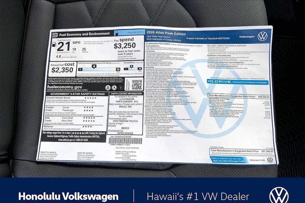 Get to know your Premier Honolulu Volkswagen Dealership, Selling New and Pre-Owned used vehicles in; Waianae, Kapolei, Ewa Beach, Waipahu, Waikele, Pearl City, Hawaii, Kai, Aiea, Mililani, Haleiwa, Honolulu, Waimanalo, Kailua, Kaneohe, Laie, Hauula, Kaaawa, Waialua, Wahiawa, Joint Base Pearl Harbor, Schofield Barracks, Pearl Harbor, Fort Schafter, Waikiki, Kaimuki, Marine Corp Base Hawaii, Kalihi, Makakilo, Oahu, https: //www.honoluluvw.com Plus government fees and taxes and $795 dealer document processing fee. MSRP includes destination and handling fee. Additional cost for dealer installed accessories. Price includes: $3000 - Retail Customer Bonus. Exp. 02/02/2026