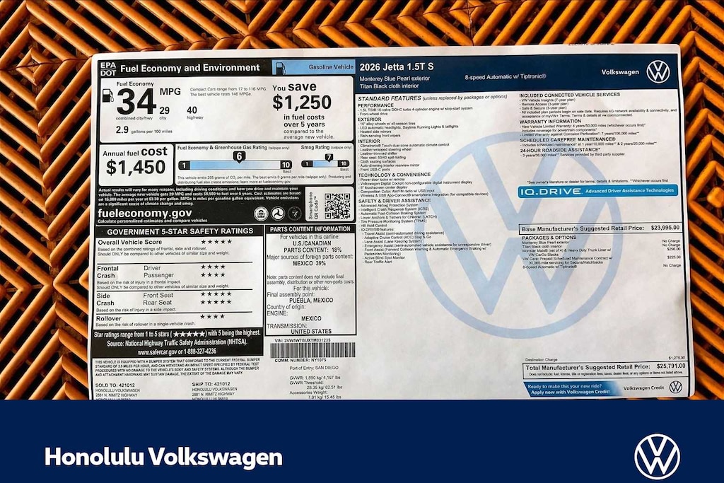 Get to know your Premier Honolulu Volkswagen Dealership, Selling New and Pre-Owned used vehicles in; Waianae, Kapolei, Ewa Beach, Waipahu, Waikele, Pearl City, Hawaii, Kai, Aiea, Mililani, Haleiwa, Honolulu, Waimanalo, Kailua, Kaneohe, Laie, Hauula, Kaaawa, Waialua, Wahiawa, Joint Base Pearl Harbor, Schofield Barracks, Pearl Harbor, Fort Schafter, Waikiki, Kaimuki, Marine Corp Base Hawaii, Kalihi, Makakilo, Oahu, https: //www.honoluluvw.com Plus government fees and taxes and $795 dealer document processing fee. MSRP includes destination and handling fee. Additional cost for dealer installed accessories. Price includes: $750 - Customer Bonus. Exp. 03/02/2026