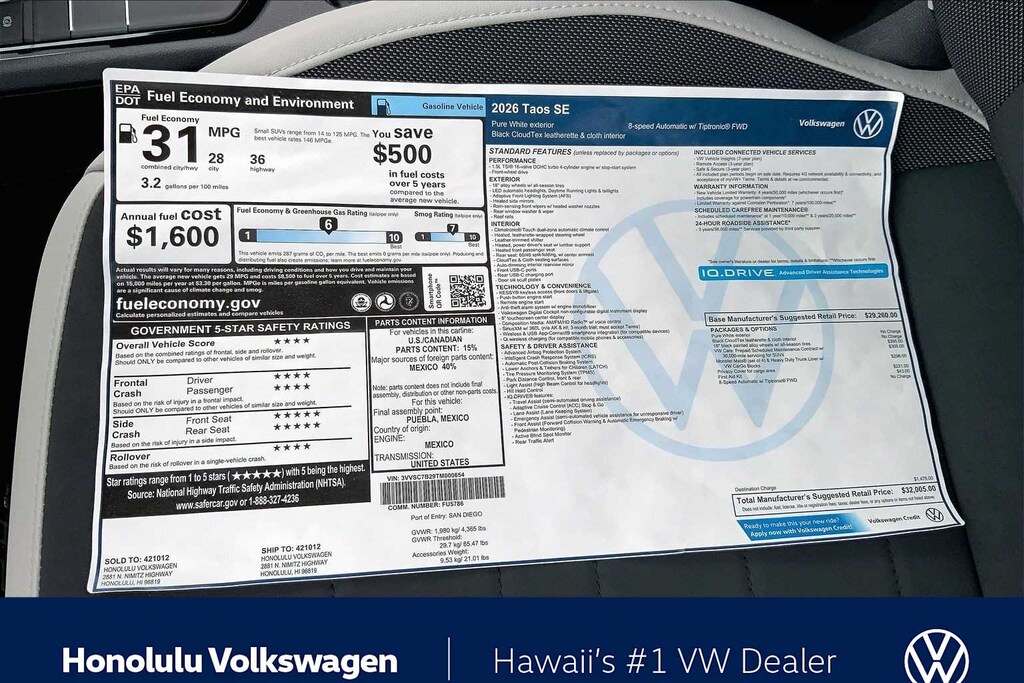 Get to know your Premier Honolulu Volkswagen Dealership, Selling New and Pre-Owned used vehicles in; Waianae, Kapolei, Ewa Beach, Waipahu, Waikele, Pearl City, Hawaii, Kai, Aiea, Mililani, Haleiwa, Honolulu, Waimanalo, Kailua, Kaneohe, Laie, Hauula, Kaaawa, Waialua, Wahiawa, Joint Base Pearl Harbor, Schofield Barracks, Pearl Harbor, Fort Schafter, Waikiki, Kaimuki, Marine Corp Base Hawaii, Kalihi, Makakilo, Oahu, https: //www.honoluluvw.com Plus government fees and taxes and $795 dealer document processing fee. MSRP includes destination and handling fee. Additional cost for dealer installed accessories. Price includes: $500 - Retail Customer Bonus. Exp. 02/02/2026