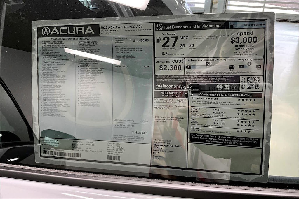 Urban Gray Pearl 2026 Acura ADX A-Spec Advance Package AWD CVT 1.5L I4 Turbocharged DOHC 16V 190hp