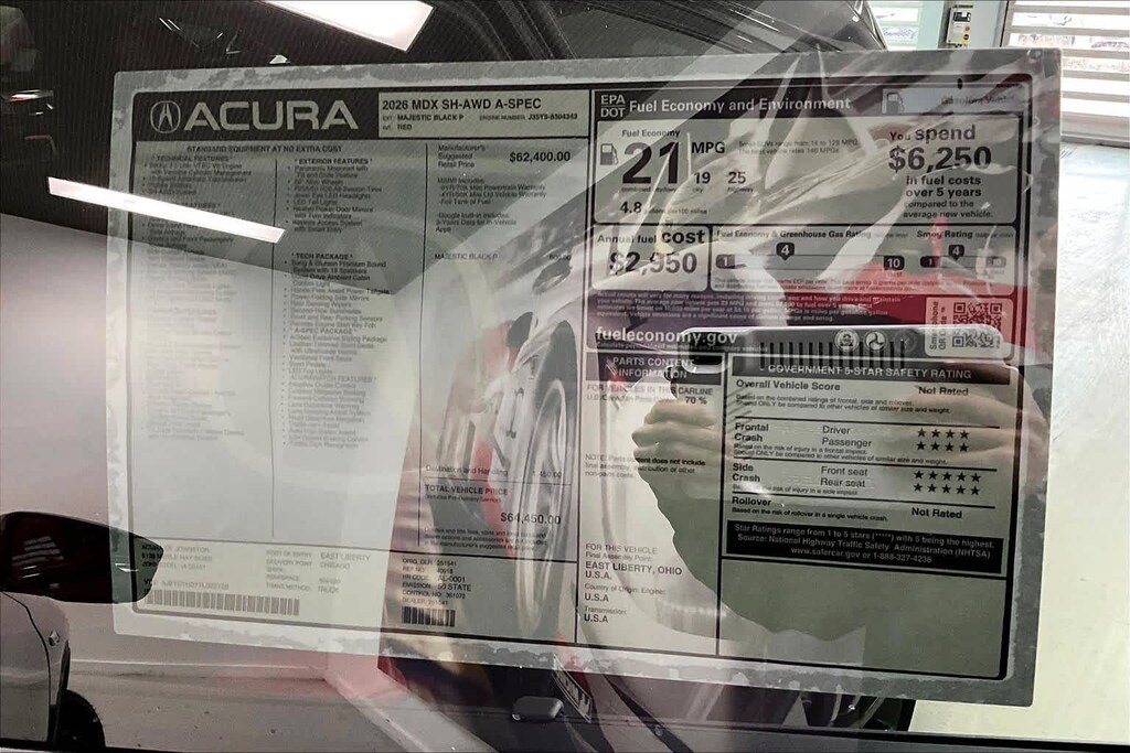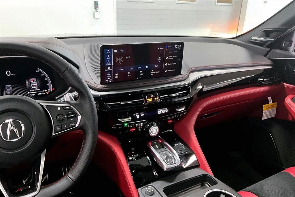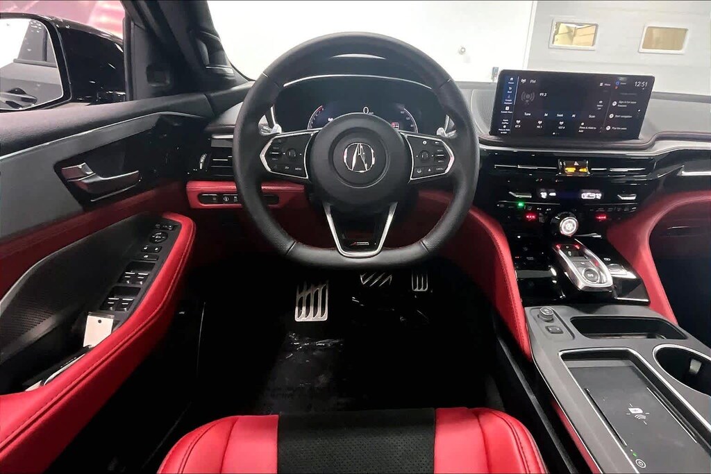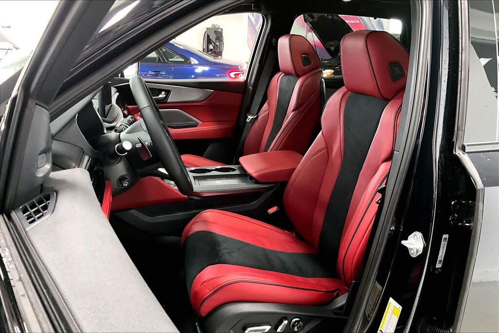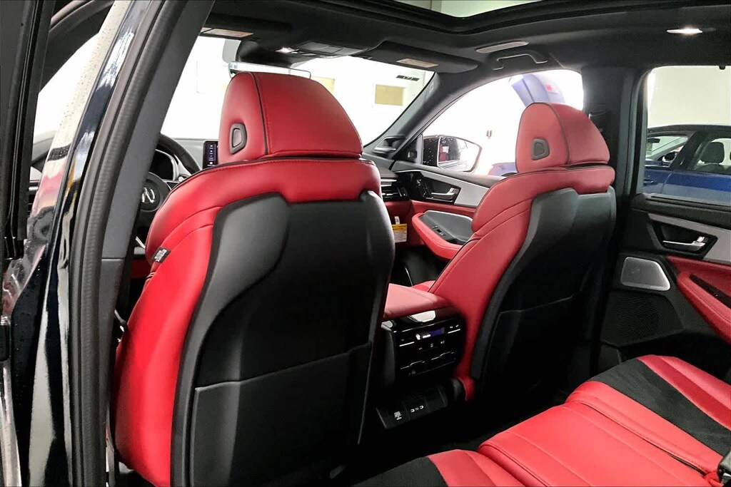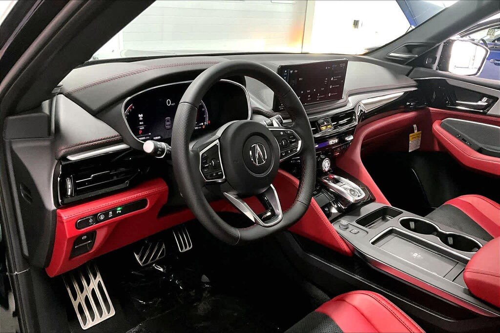 MDX A-Spec is nicely equipped with Re/Red Leather, 19 Speakers, 3rd row seats: split-bench, 4-Wheel Disc Brakes, ABS brakes, Air Conditioning, Alloy wheels, AM/FM radio, Anti-whiplash front head restraints, Apple CarPlay/Android Auto, Audio memory, Auto High-beam Headlights, Auto tilt-away steering wheel, Auto-dimming Rear-View mirror, Automatic temperature control, Brake assist, Bumpers: body-color, Compass, Delay-off headlights, Driver door bin, Driver vanity mirror, Dual front impact airbags, Dual front side impact airbags, Electronic Stability Control, Emergency communication system: AcuraLink, Exterior Parking Camera Rear, Four wheel independent suspension, Front anti-roll bar, Front Bucket Seats, Front Center Armrest, Front dual zone A/C, Front fog lights, Front reading lights, Fully automatic headlights, Garage door transmitter: HomeLink, Heated and Ventilated Front Sport Seats, Heated door mirrors, Heated front seats, HVAC memory, Illuminated entry, Knee airbag, Lane departure: Lane Keeping Assist System (LKAS) active, Leather steering wheel, Low tire pressure warning, Memory seat, Navigation system: Google built-in (3-Years Unlimited Data Plan for In-Vehicle Apps), Occupant sensing airbag, Outside temperature display, Overhead airbag, Overhead console, Panic alarm, Passenger door bin, Passenger vanity mirror, Perforated Premium Milano Leather and Ultrasuede Seats, Power door mirrors, Power driver seat, Power Liftgate, Power moonroof, Power passenger seat, Power steering, Power windows, Premium audio system: Acura/ELS Studio 3D, Radio data system, Radio: Bang & Olufsen Premium Audio System, Rain sensing wipers, Rear air conditioning, Rear anti-roll bar, Rear reading lights, Rear seat center armrest, Rear window defroster, Rear window wiper, Remote keyless entry, Security system, Speed control, Speed-sensing steering, Speed-Sensitive Wipers, Split folding rear seat, Spoiler, Sport steering wheel, Steering wheel memory, Steering wheel mounted audio controls, Tachometer, Telescoping steering wheel, Tilt steering wheel, Traction control, Trip computer, Turn signal indicator mirrors, Variably intermittent wipers, Ventilated front seats, and Wheels: 20 x 9J Aluminum Alloy.